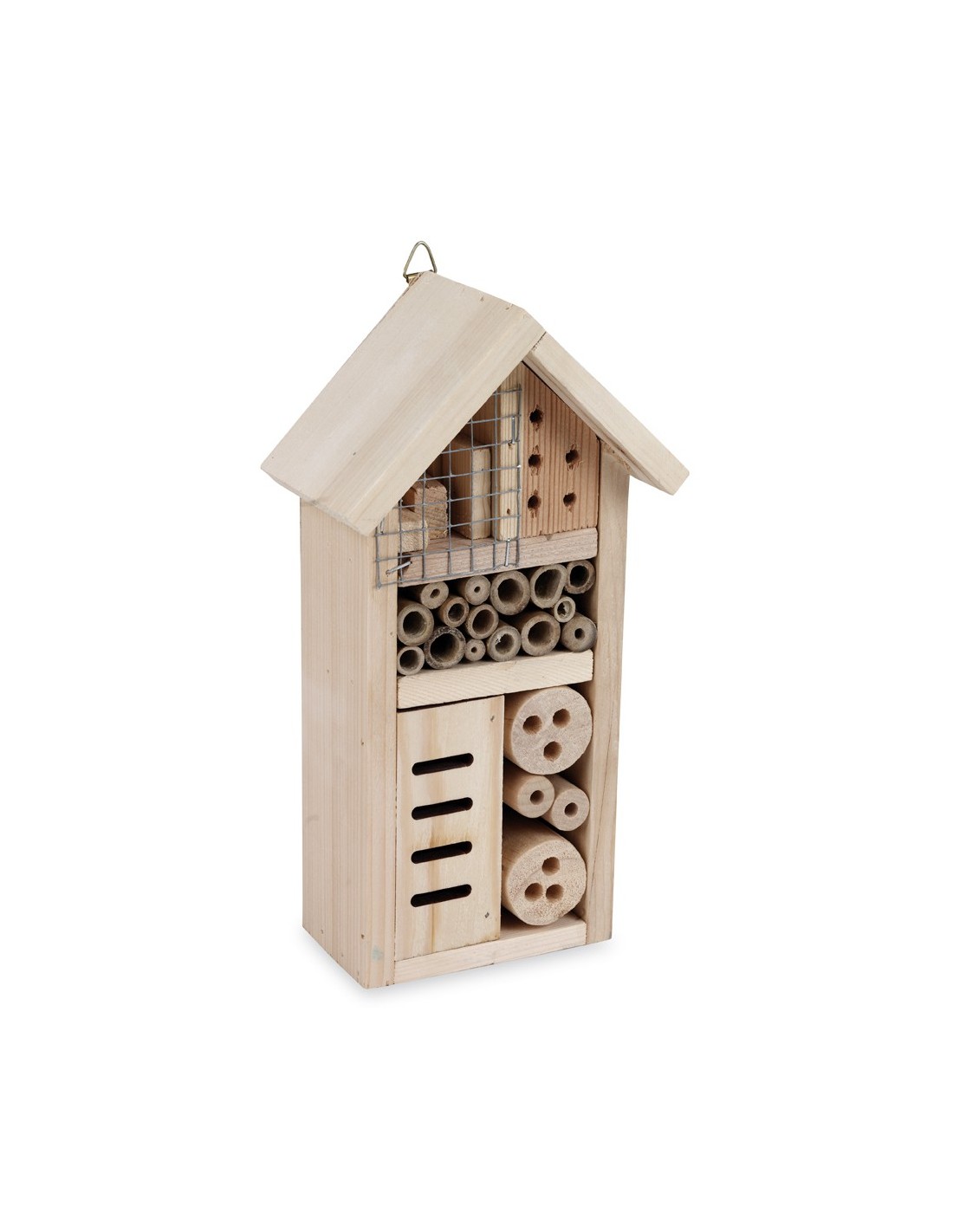 Fabricada con madera natural, esta casita ofrece varios compartimentos diseñados para atraer y dar refugio a diferentes insectos beneficiosos como abejas, mariquitas y mariposas.