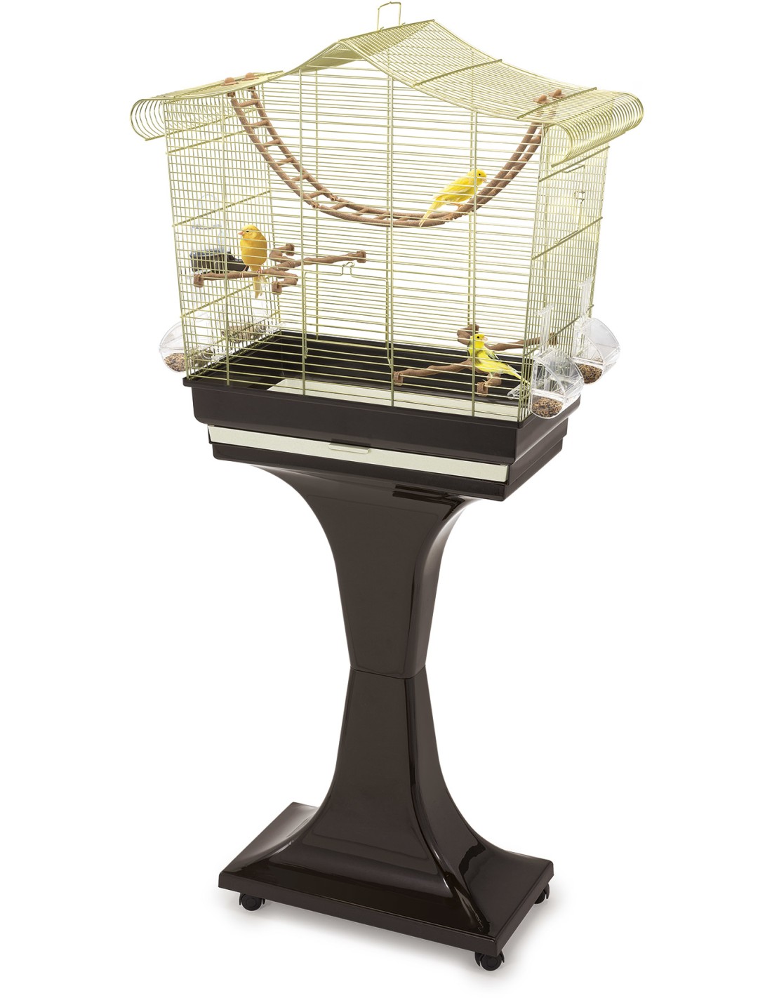 Con medidas de 62,5 cm de ancho, 33 cm de profundidad y 61-132 cm de altura (con el pie), esta jaula es ideal para canarios, agapornis y periquitos.