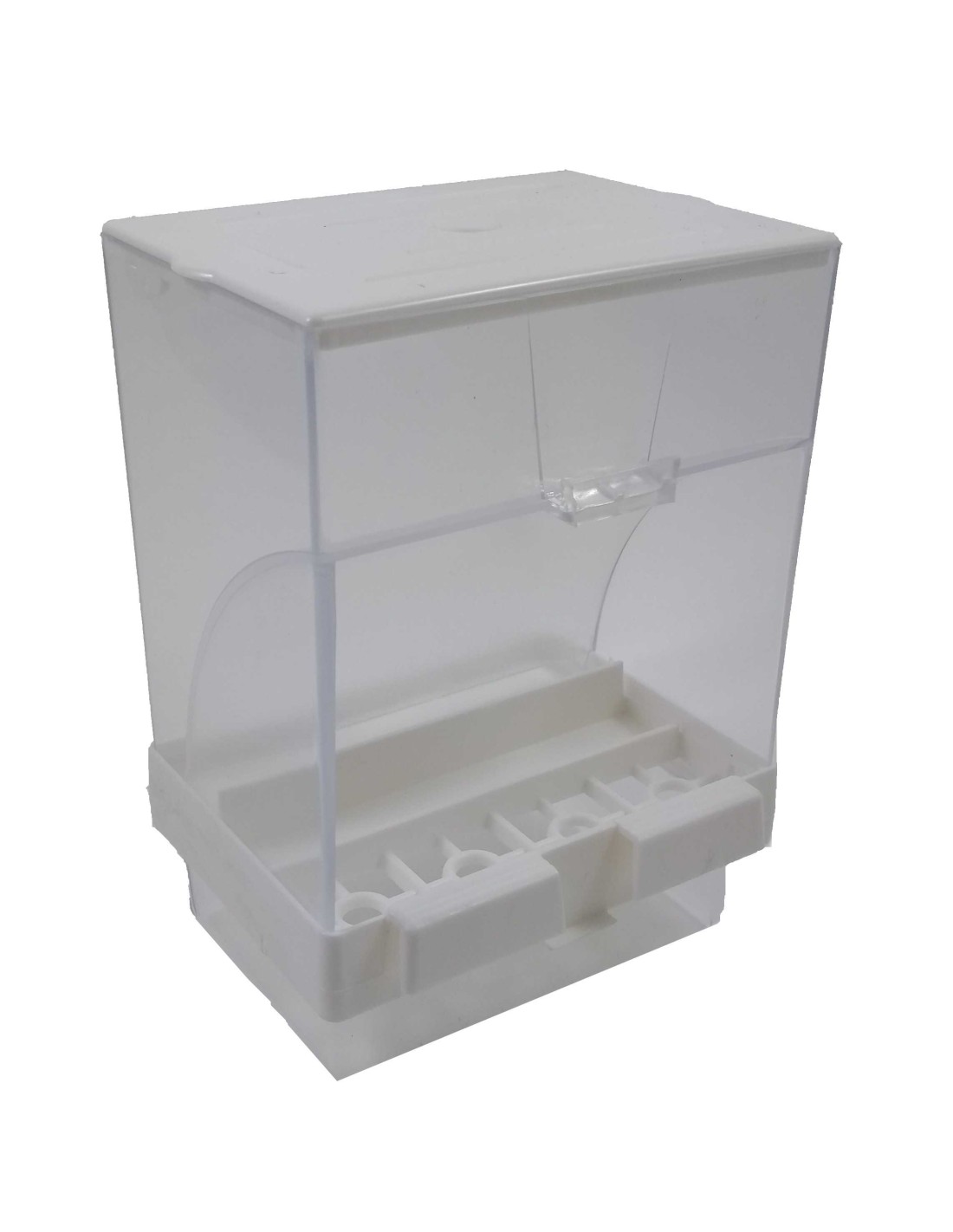Su diseño incluye una tapa superior desmontable que facilita el llenado y la limpieza, mientras que su sistema de tolva permite que el alimento caiga de manera controlada, evitando desperdicios.