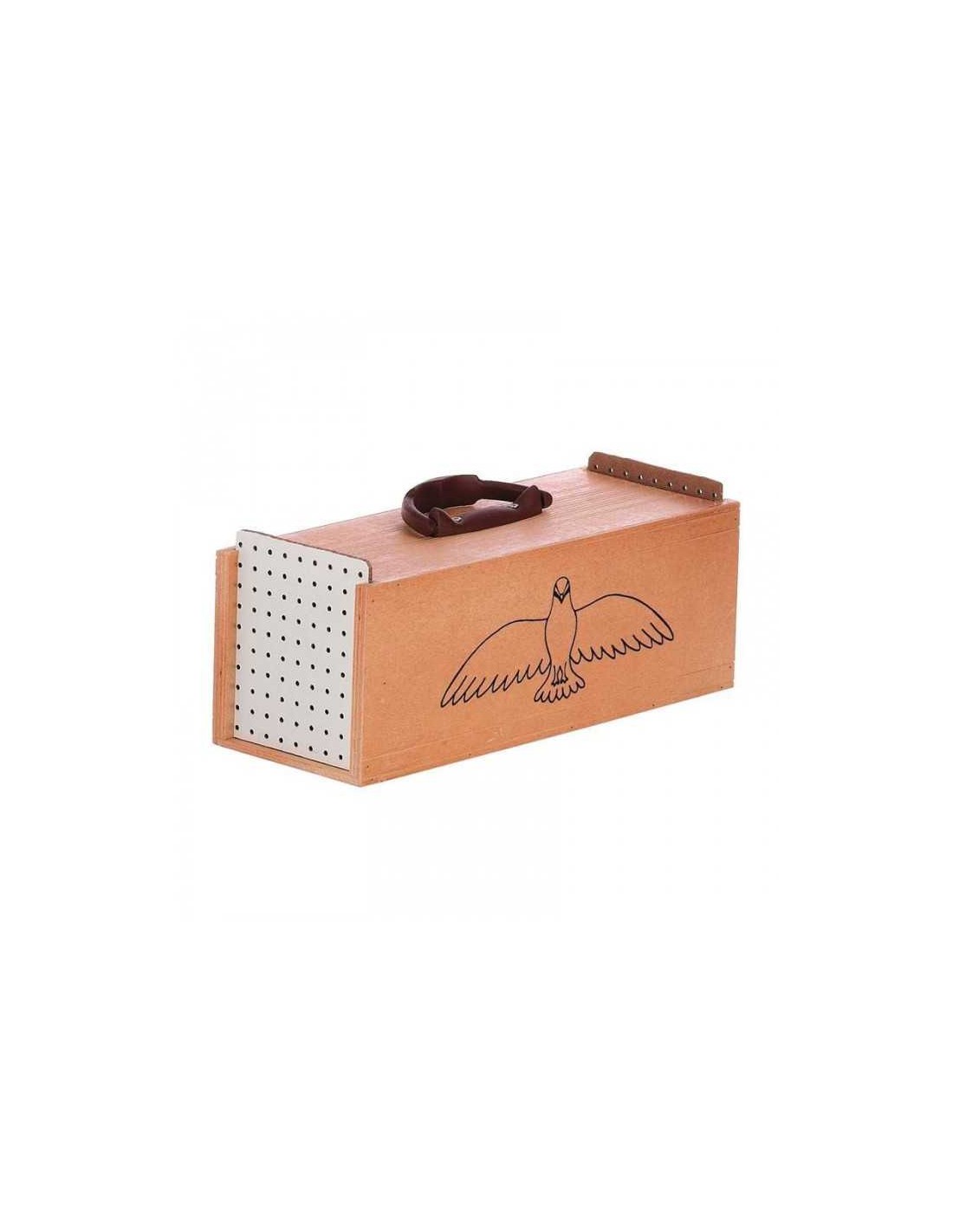Transportín individual de madera para palomas, en cuña.#Dimensiones: 33,5 x 15 x 14 cm##