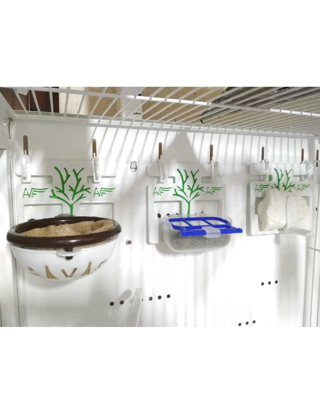 El soporte KM para accesorios de Moldes Ave permite incorporar accesorios en el interior de cualquier jaula a la vez que despeaja el frontal de la misma.