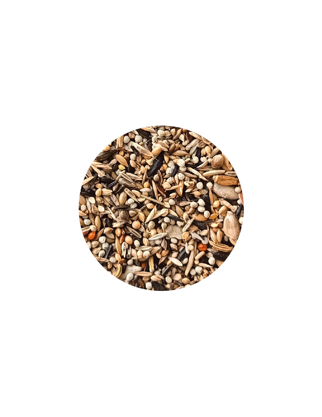 Esta mezcla incluye una variedad de semillas, granos y frutas secas que proporcionan una dieta equilibrada y completa.