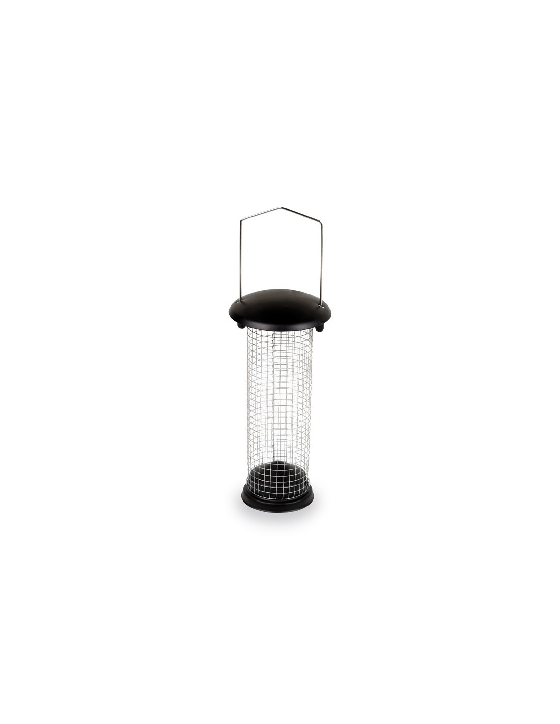 Su diseño incluye una malla que permite a las aves acceder fácilmente a los cacahuetes, mientras que la base y la tapa aseguran que el alimento se mantenga limpio y seco.