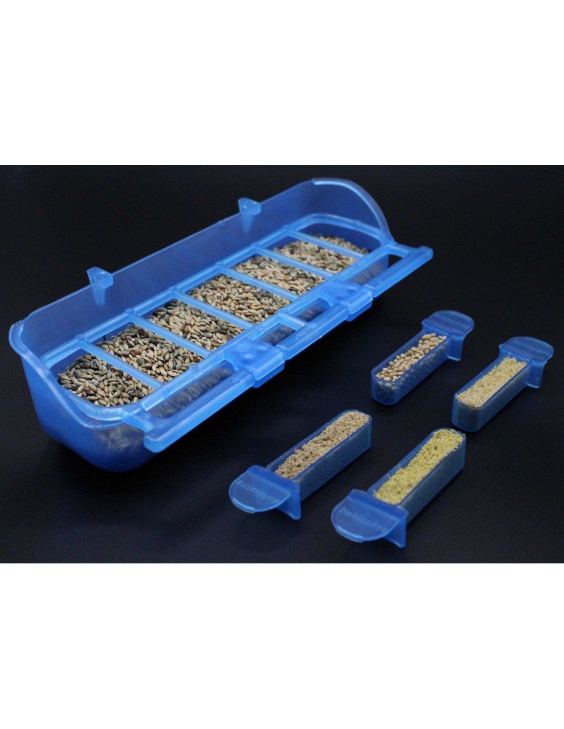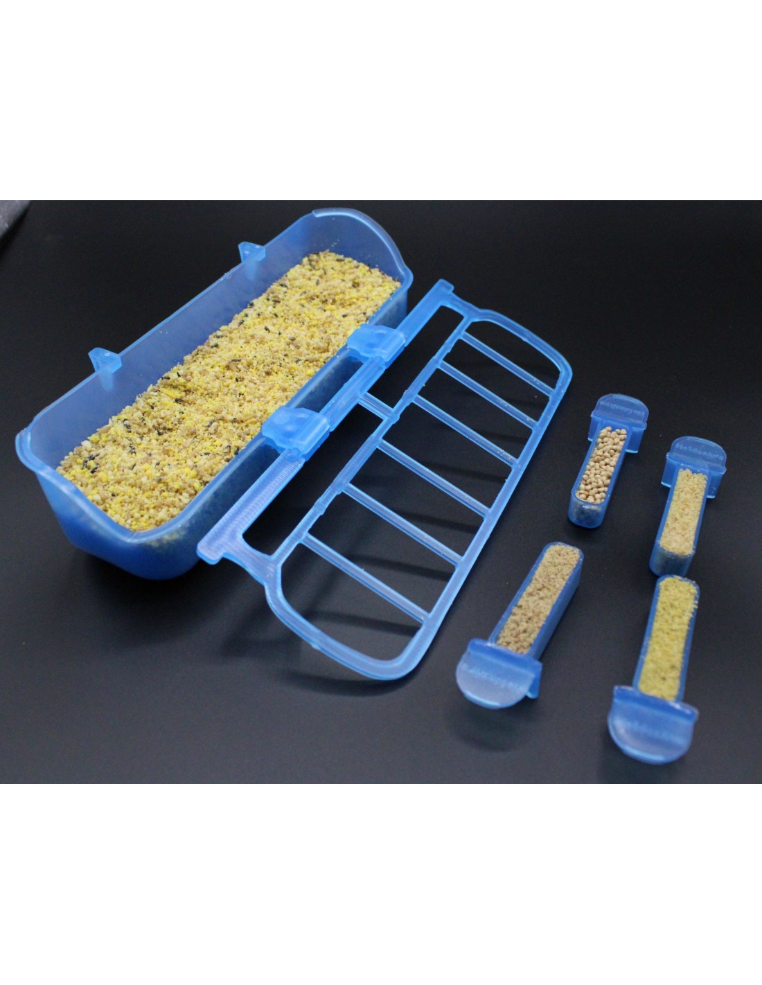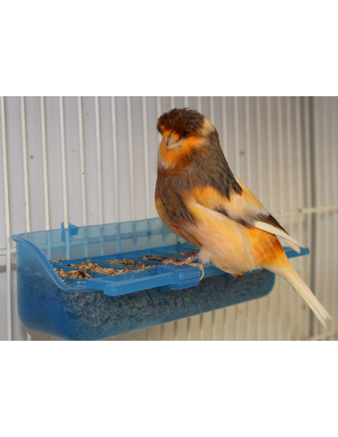 El comedero Celia de Moldes Ave es un comedero interior ideal para voladeras, con rastrillo para evitar que los pájaros tiren el alimento fera y con una cómoda posadera para facilitarles el acceso a la comida.