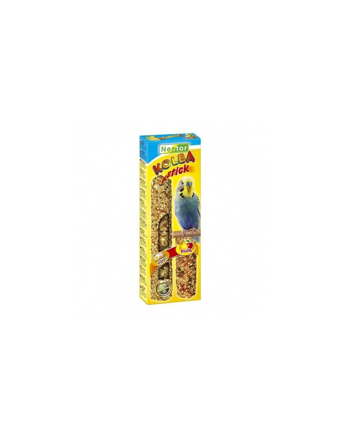 El NESTOR STICK 2 EN 1 con Huevo y Frutas para Periquitos 85 GR (2 Unidades) es una deliciosa y nutritiva golosina que combina los beneficios del huevo y las frutas frescas.