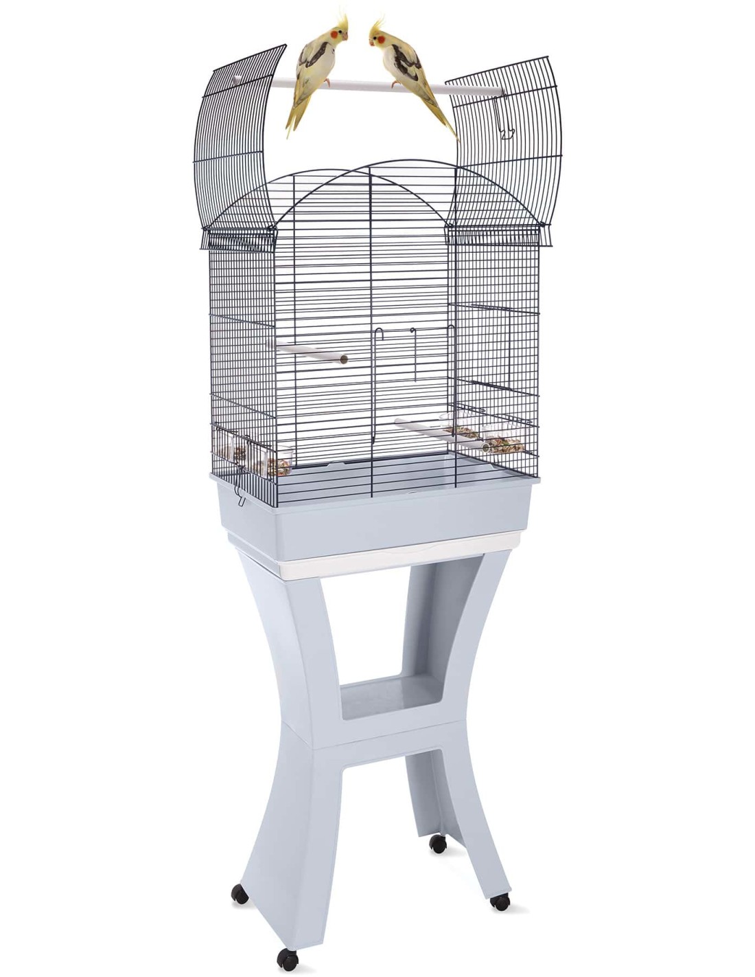 Con un diseño elegante en color azul, esta jaula incluye cuatro comederos, palos posaderos y una bandeja extraíble para facilitar la limpieza.
