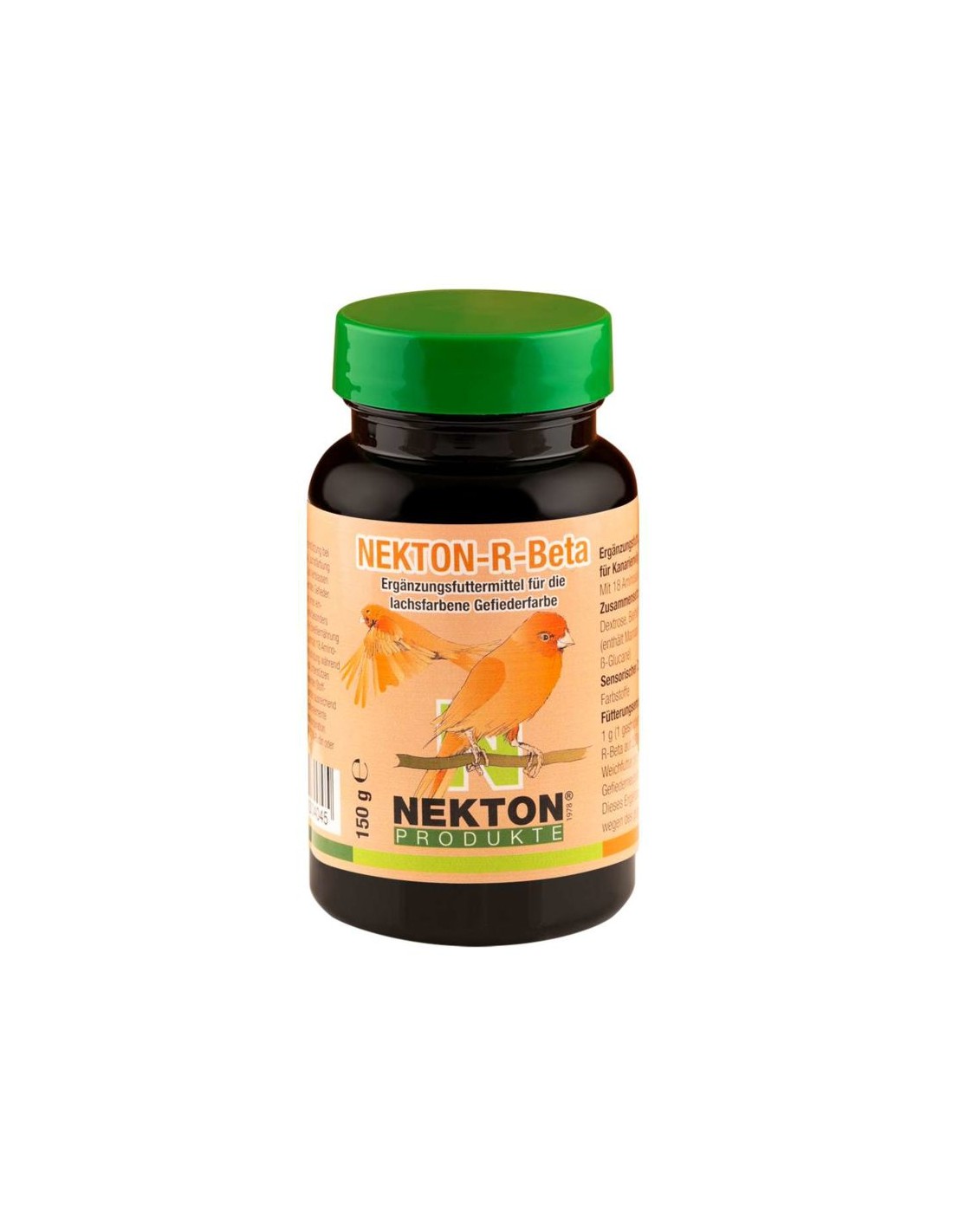NEKTON-R-BETA intensifica los colores del plumaje de los canarios de color, realzando especialmente los tonos rojizos. NEKTON-R-BETA, con sus ingredientes activos, refuerza un suave y ordenado cambio del plumaje y fomenta su crecimiento en pájaros jóvenes. Debido a su solubilidad NEKTON-R-BETA se suministra fácilmente en el agua de bebida o también sobre la fruta o pasta de huevo. Como las plumas sólo pueden verse influenciadas durante su crecimiento, añadir NEKTON-R-BETA justo al principio del periodo de muda o inmediatamente después del nacimiento de los pollos y dejar de suministrar en cuanto estén completamente desarrolladas las plumas. Vitaminas : vitamina A, vitamina D3, vitamina E, vitamina B1, vitamina B2, d-pantotenato de calcio, amida del ácido nicotínico, vitamina B6, ácido fólico, vitamina B12, vitamina C, vitamina K3, biotina. Aminoácidos : DL-metionina / L-lisina / L-alanina / L-arginina / L-ácido aspártico / L-cistina / L-glutamina / L-glicina / L-histidina / L-isoleucina / L-leucina / L-fenilalanina / L-prolina / L-serina / L-treonina / L-triptófano / L-tirosina / L-valina Minerales y oligoelementos : calcio / zinc / manganeso / cobre / hierro /cobalto / yodo / Magnesio Carotenoide : beta-caroteno