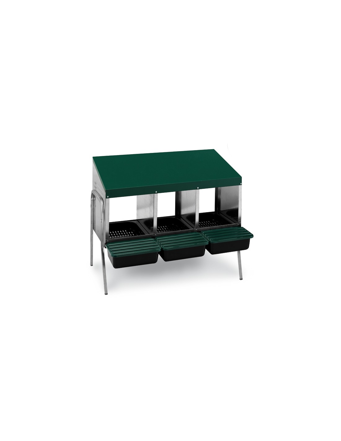 Fabricado con chapa galvanizada de alta calidad, este ponedero cuenta con tres departamentos independientes, cada uno equipado con su propia cubeta.