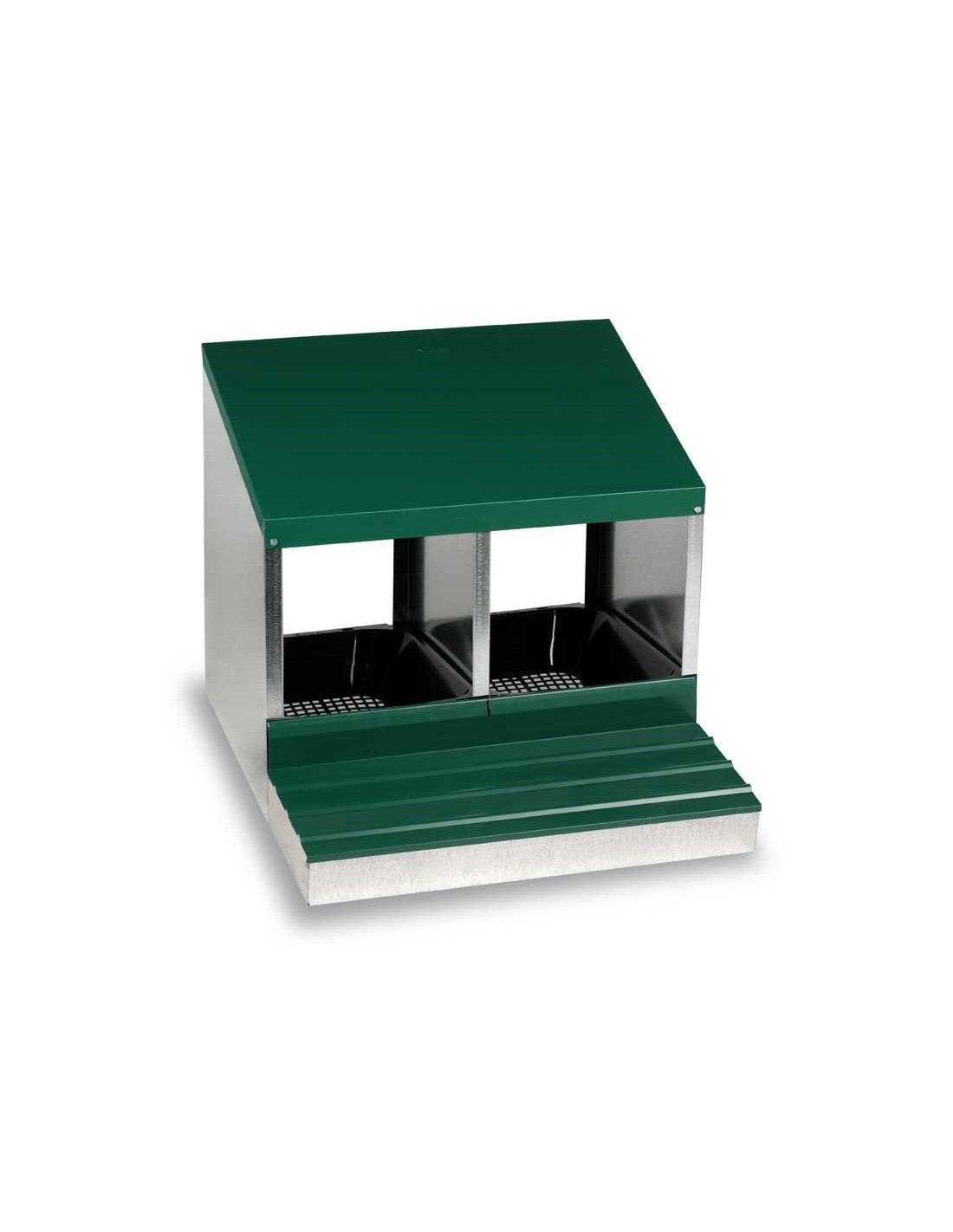 Fabricado con chapas galvanizadas, este ponedero cuenta con dos departamentos independientes, cada uno equipado con una cubeta ponedero.