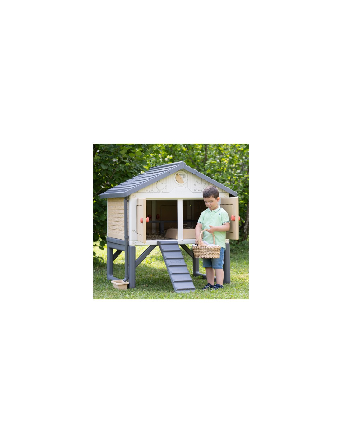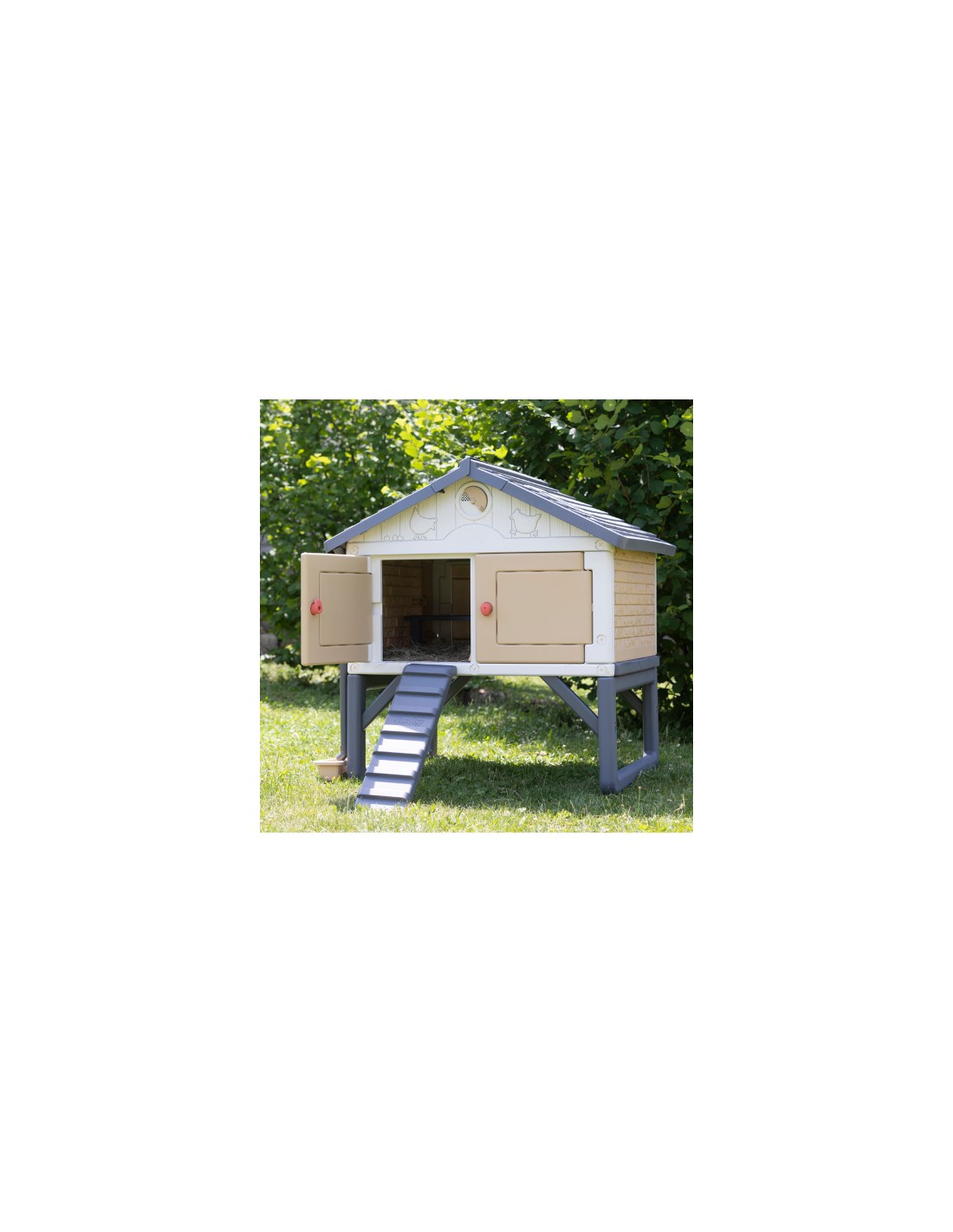 Incluye 4 puertas con sistema de bloqueo, una rampa de acceso, un aseladero y un nido para la puesta de huevos.