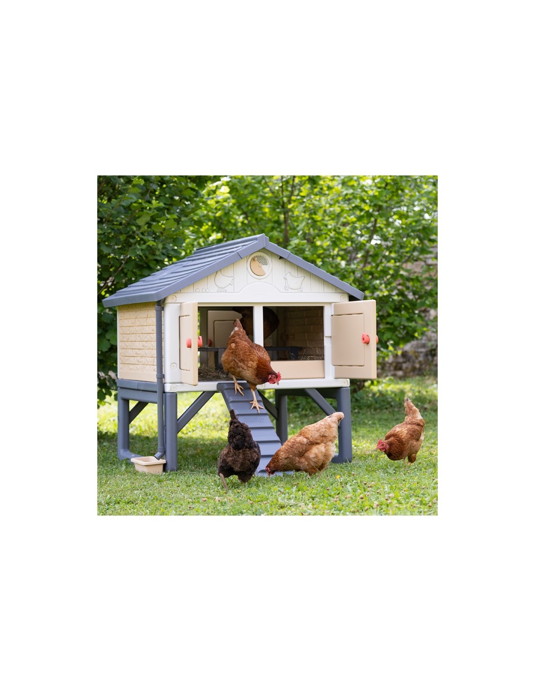 Diseñado para alojar hasta 5 gallinas, este gallinero está fabricado en plástico resistente con protección UV, lo que garantiza durabilidad y fácil mantenimiento.