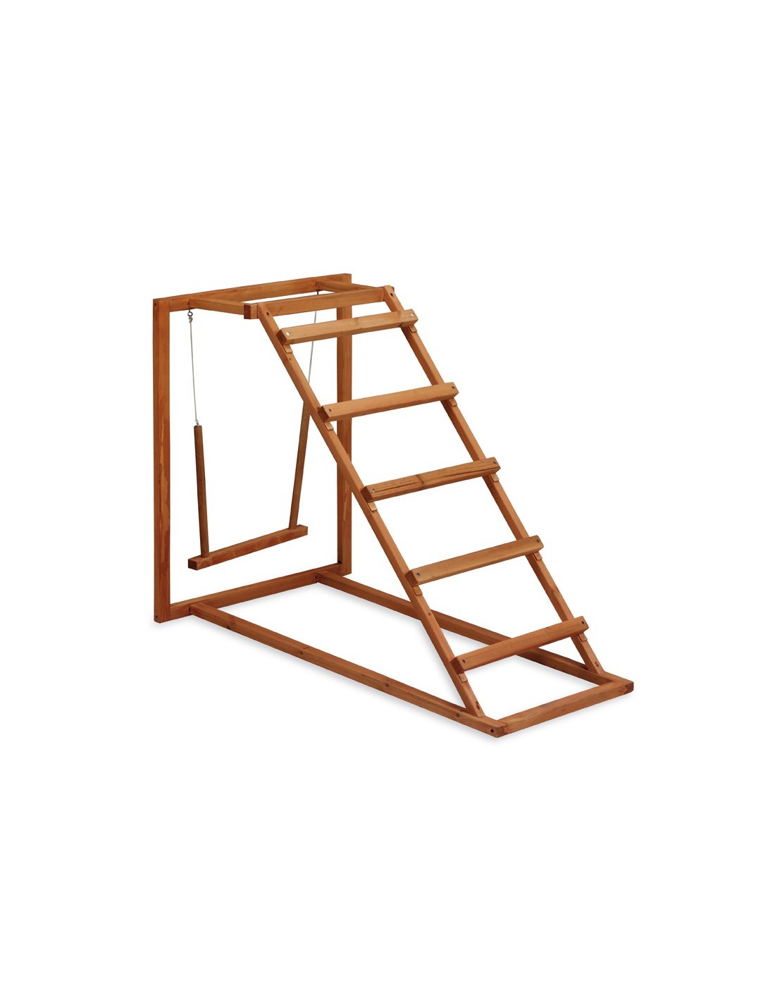 Incluye una variedad de elementos como escaleras, perchas y un columpio, que permiten a las gallinas trepar, posarse y divertirse.