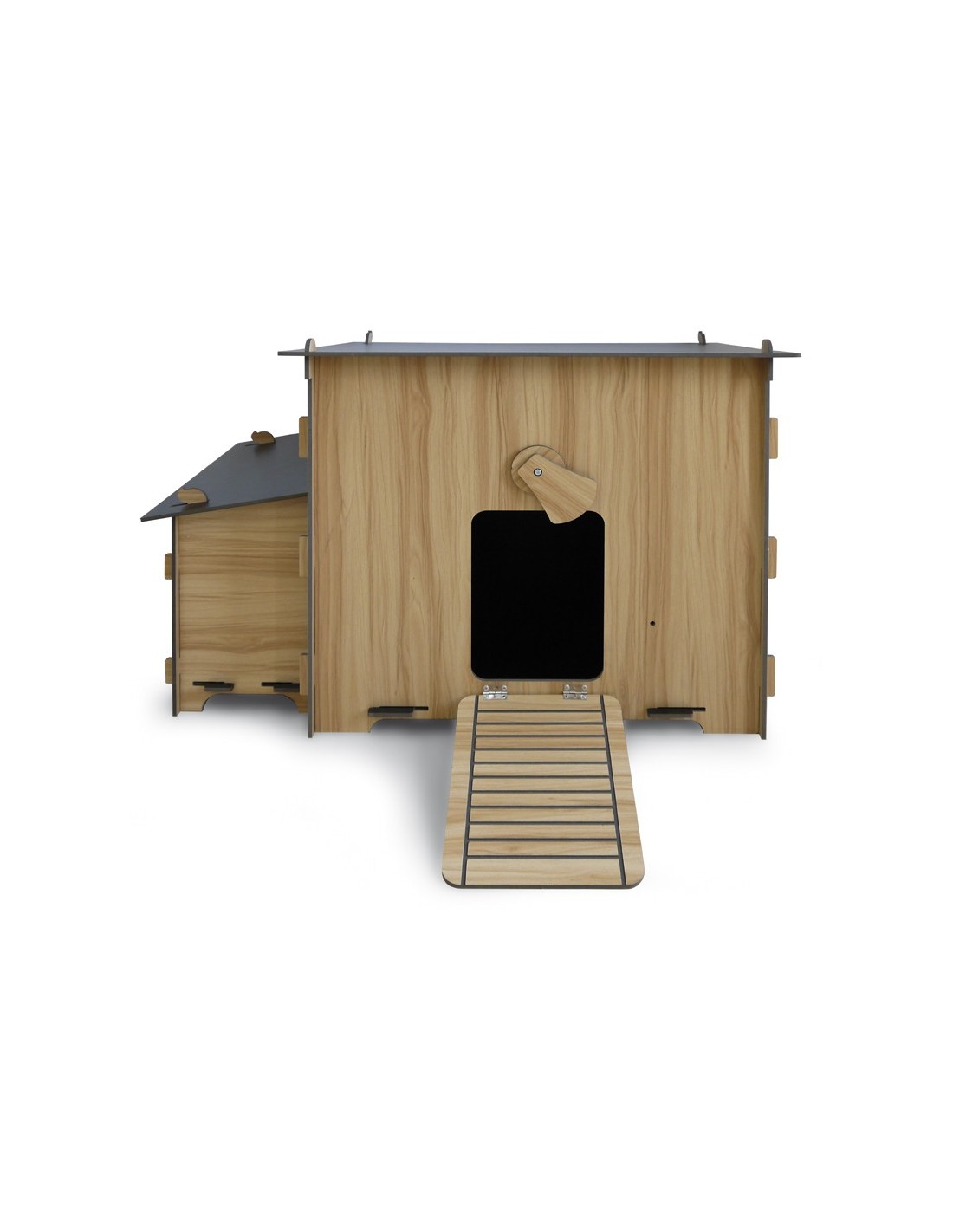 El diseño incluye una rampa de acceso fácil, un ponedero con tapa abatible para recoger huevos cómodamente y un área amplia para el descanso de las aves.