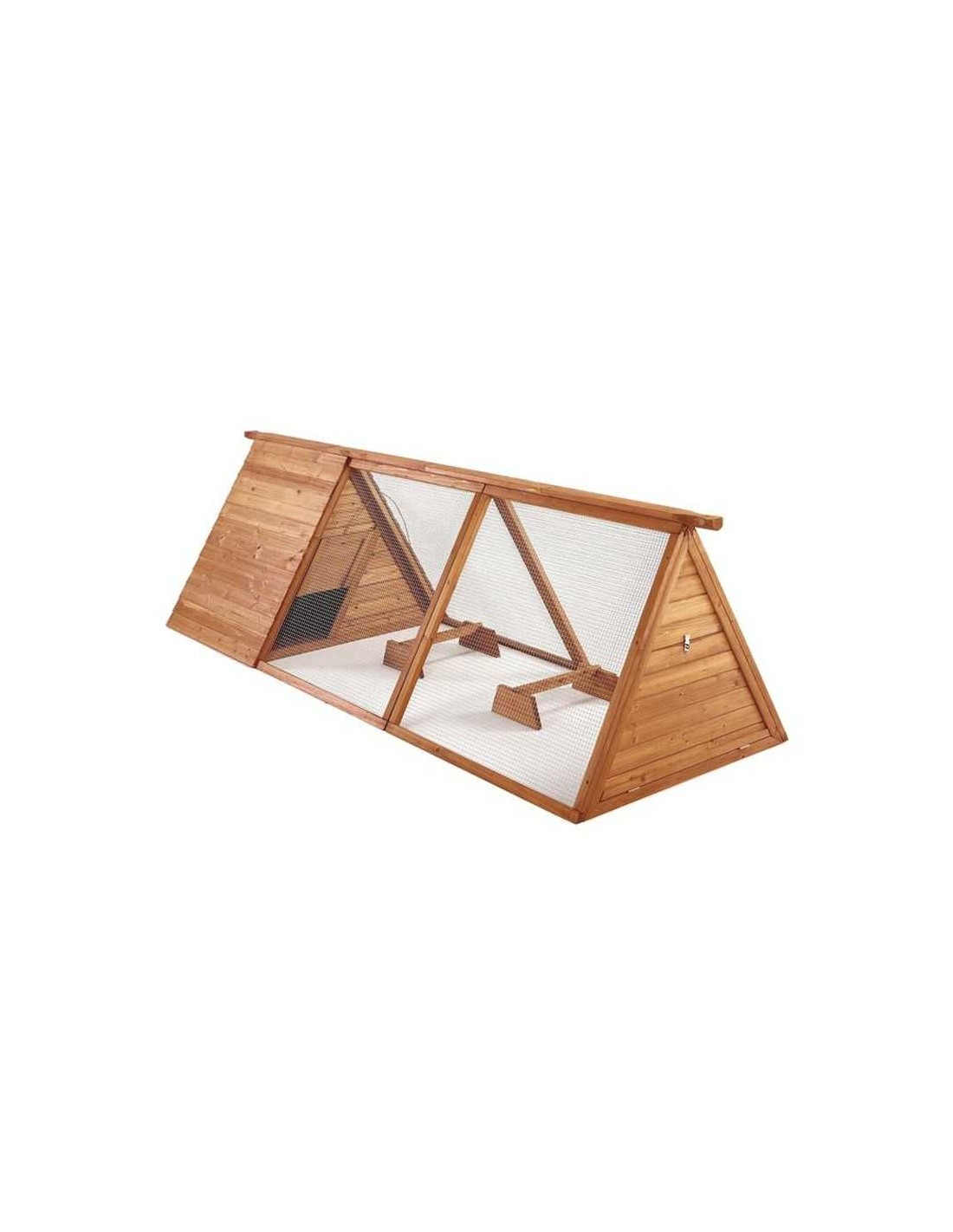 Con un diseño espacioso y resistente, cuenta con un techo a dos aguas que protege a las aves de la lluvia y el sol.