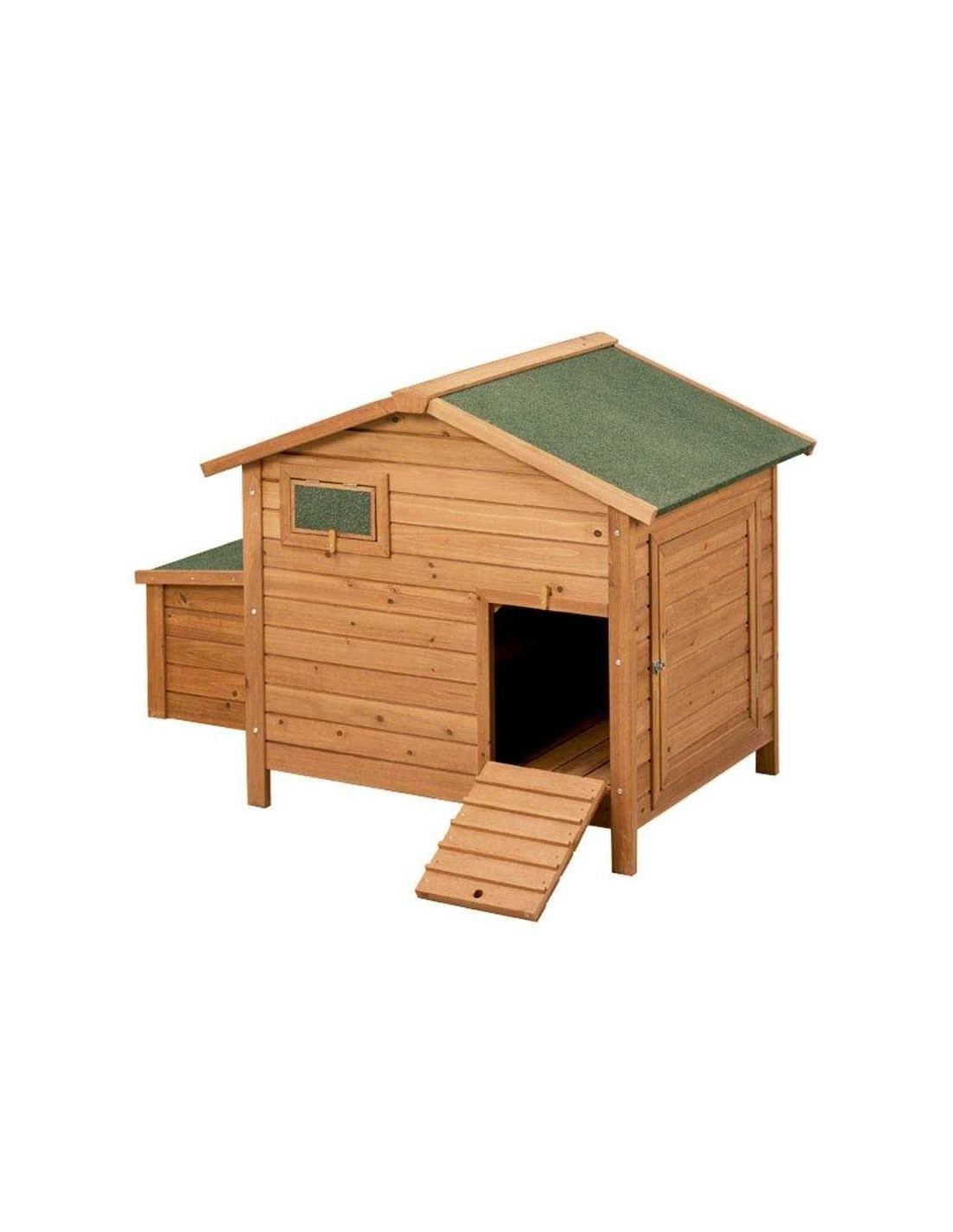 Con un diseño robusto y resistente, incluye un techo impermeable a dos aguas y una puerta lateral para facilitar la limpieza del nido.