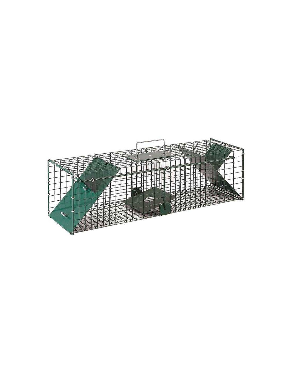 Fabricada con chapa galvanizada resistente, cuenta con dos puertas de entrada que se cierran automáticamente al atrapar a la rata.