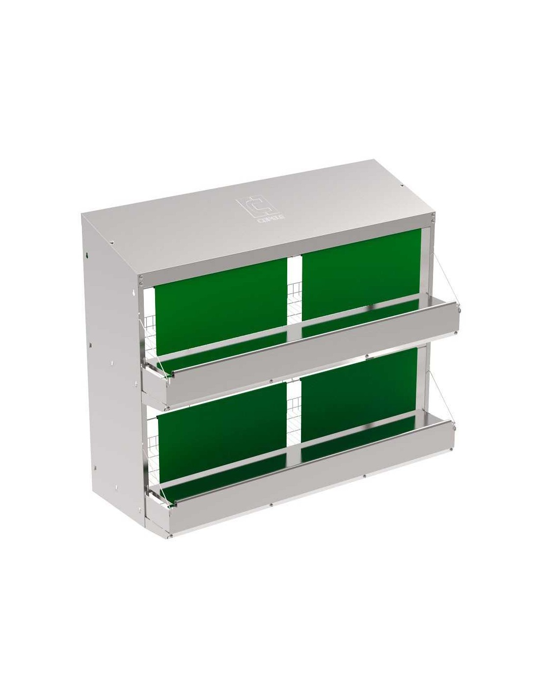 Con capacidad para hasta 100 gallinas, este ponedero cuenta con un diseño de dos niveles que optimiza el espacio y facilita el acceso a los huevos.