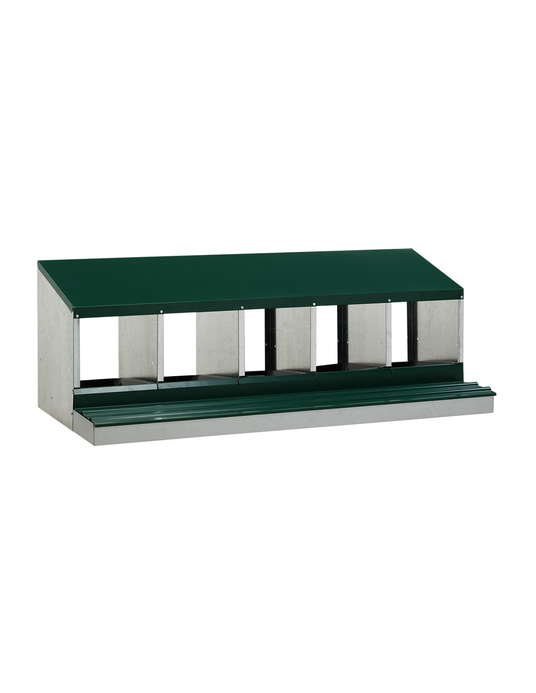 Con cinco departamentos, permite que varias gallinas pongan sus huevos en un mismo lugar, optimizando el espacio y promoviendo un entorno ordenado y limpio.