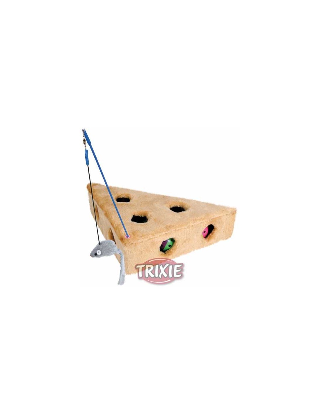 El TROZO QUESO CON AGUJEROS Y 3 JUGUETES de TRIXIE es un juguete interactivo diseñado para mantener a tu gato entretenido y activo.