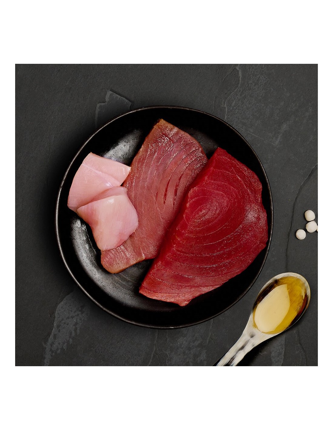 Este alimento húmedo premium combina atún fresco y jugoso pollo, cocinados en su propio jugo para preservar todos los nutrientes y sabores naturales.