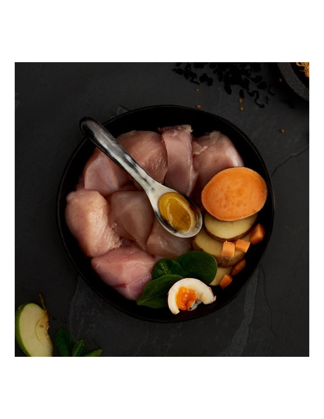 Además del pollo, incluye verduras y hierbas seleccionadas cuidadosamente, como batata, zanahoria, espinacas y algas marinas, que proporcionan nutrientes esenciales y antioxidantes naturales.