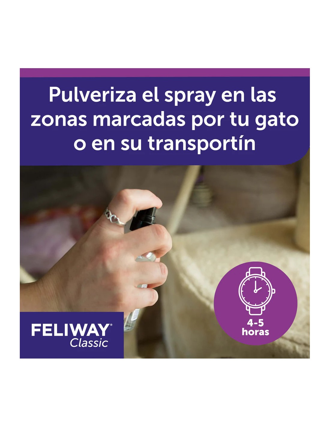 Este spray contiene feromonas sintéticas que replican las señales naturales de tranquilidad que los gatos emiten cuando se sienten seguros.