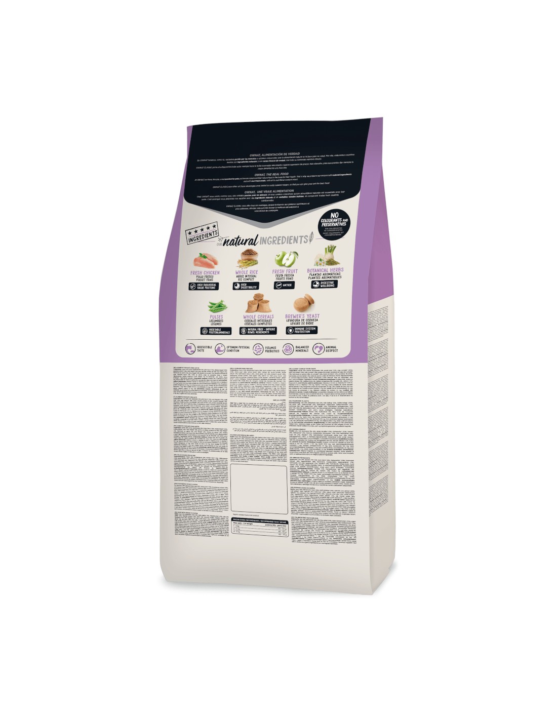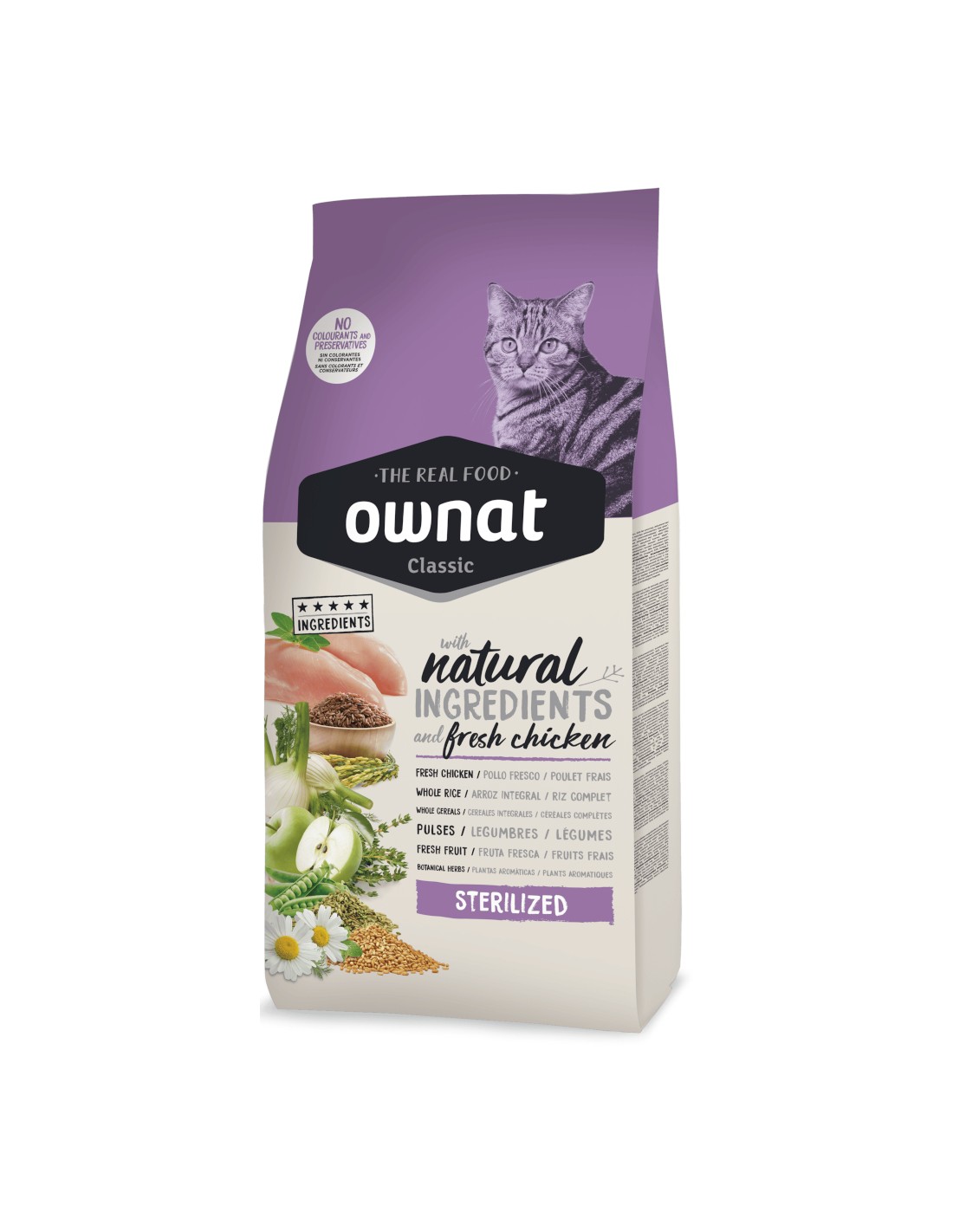 Con un 36% de carnes deshidratadas y un 10% de pollo fresco, el OWNAT CLASSIC STERILIZED proporciona proteínas de alto valor biológico esenciales para la salud y el bienestar de tu gato.