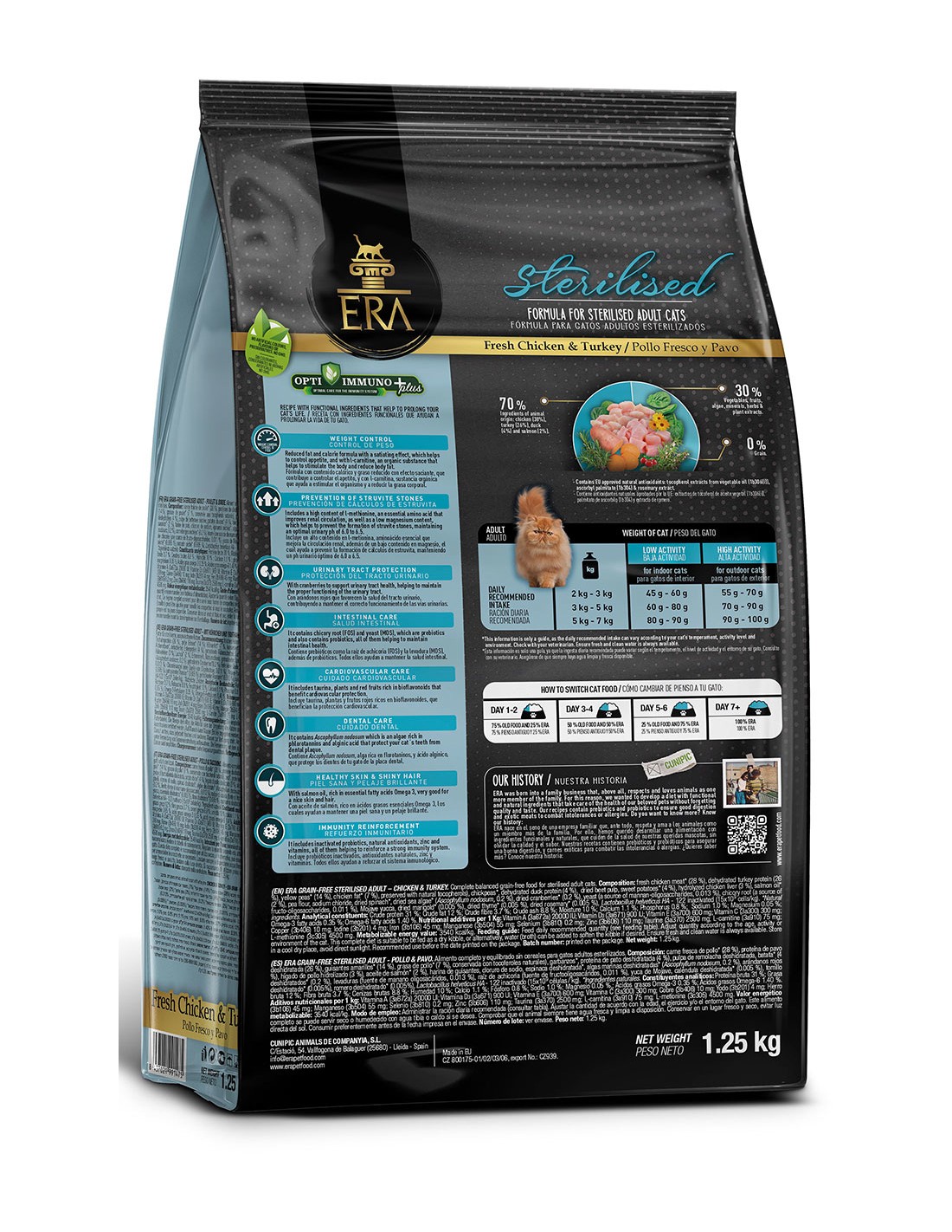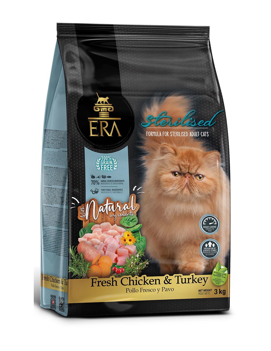 El PIENSO ERA GRAIN FREE CAT STERILISED POLLO Y PAVO es una opción ideal para gatos adultos esterilizados que buscan una alimentación saludable y libre de cereales.