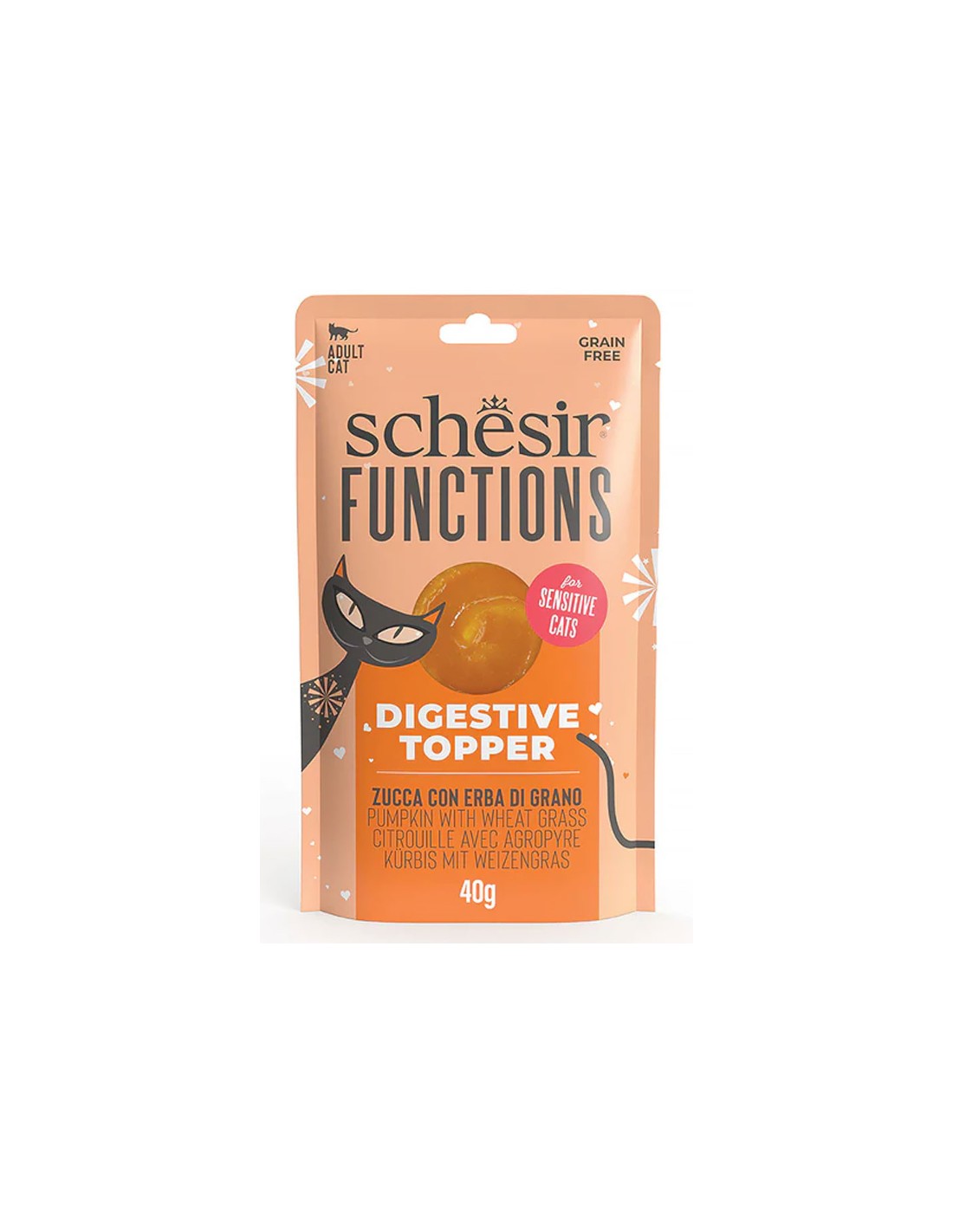 TOPPER FUNCIÓN DIGESTIVA CALABAZA CON HIERBA DE TRIGO PARA GATOS (12 UNIDADES) SCHESIR - 12 X 40 GR