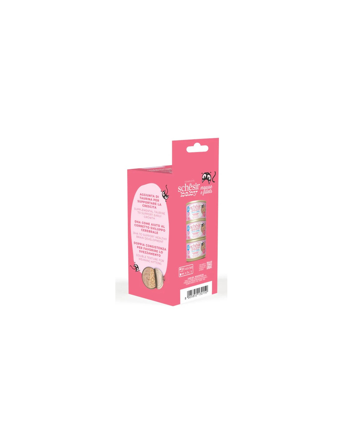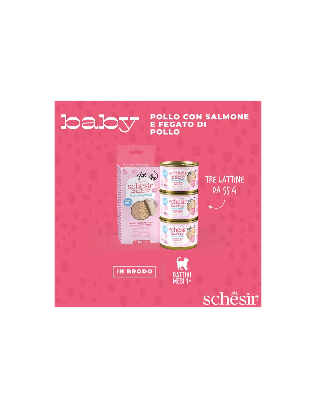 BABY DOBLE TEXTURE MOUSSE&FILETES POLLO CON SALMON Y HIGADO POLLO PARA GATITOS (3 UNIDADES) SCHESIR - 3 X 55 GR