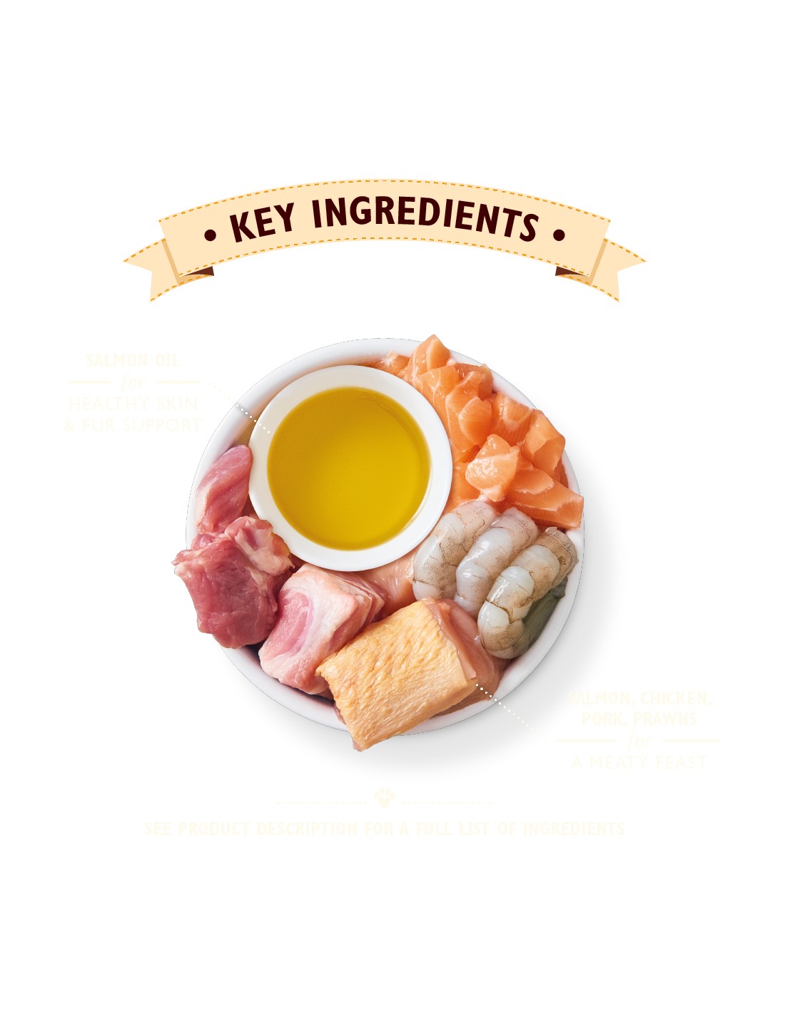 Este paquete contiene 19 unidades de 85 gramos, elaboradas con ingredientes naturales como salmón, pollo y gambas de alta calidad.