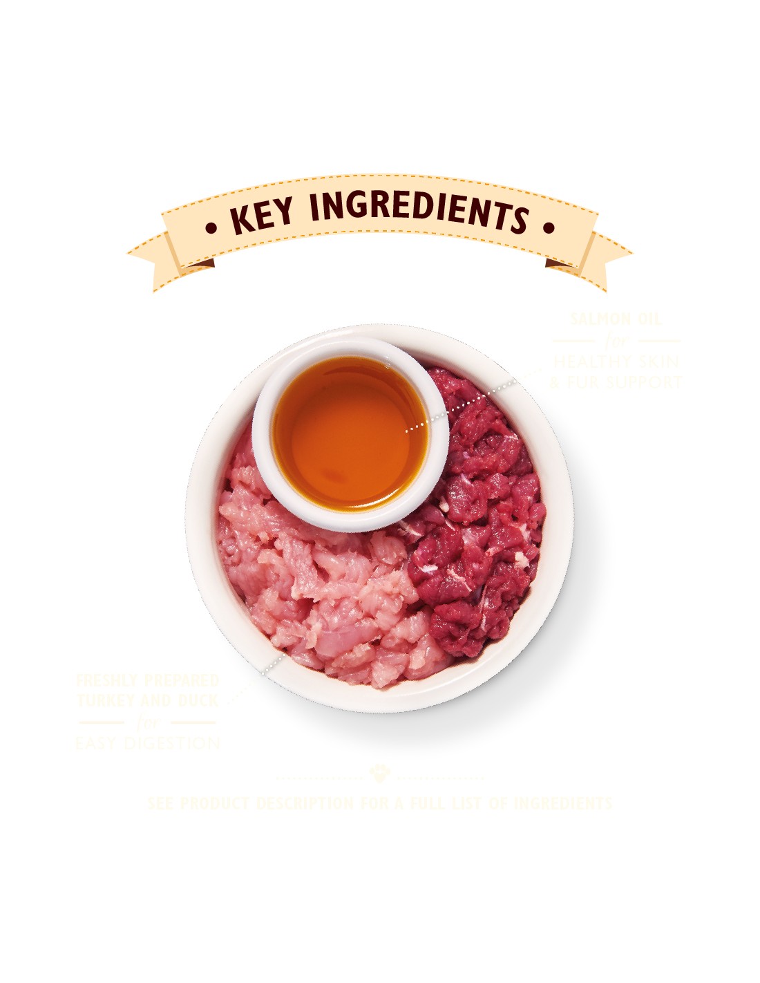 Este paquete contiene 19 unidades de 85 gramos, cada una elaborada con ingredientes naturales de alta calidad como pavo fresco y pato.