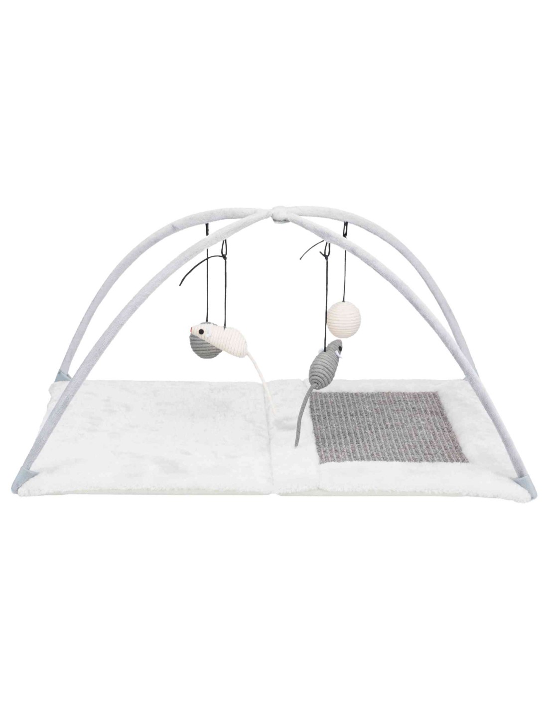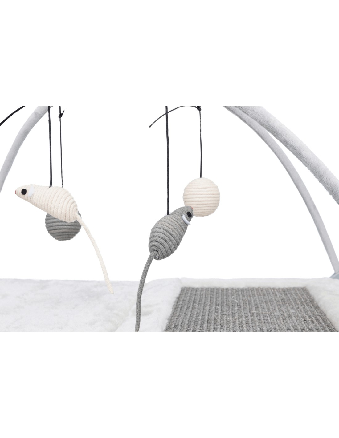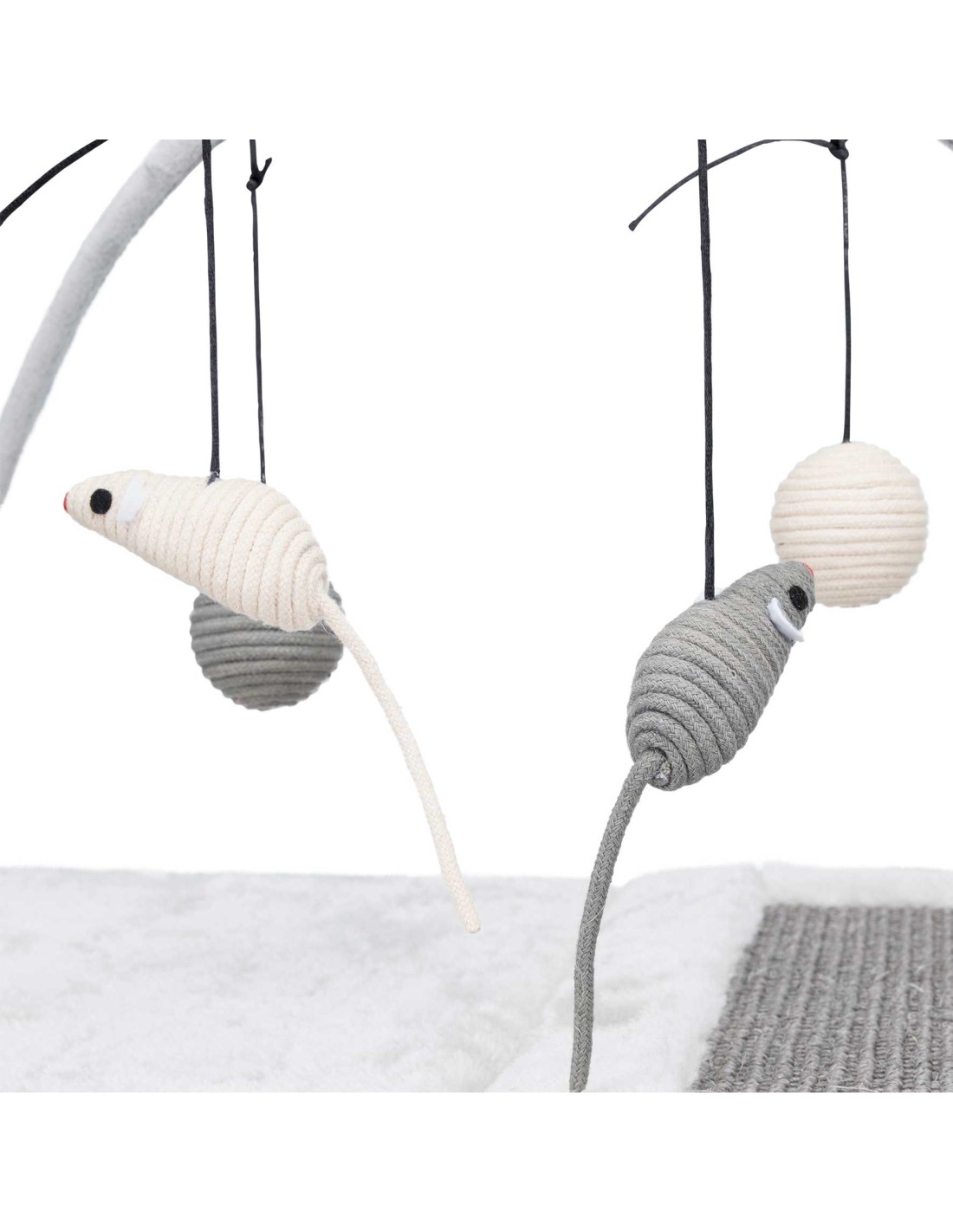 Con un diseño atractivo y funcional, esta alfombrilla incluye varios juguetes de cuerda que invitan a los gatos a jugar y rascar.