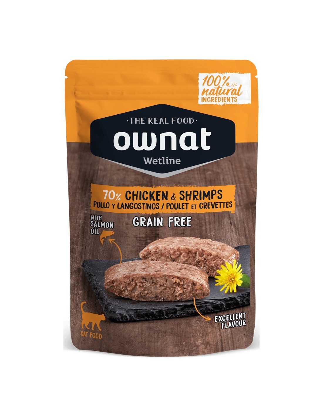 El Ownat Pouche Pollo y Gambas para Gatos - 85 gr es un alimento húmedo gourmet diseñado para los paladares más exigentes de los felinos.