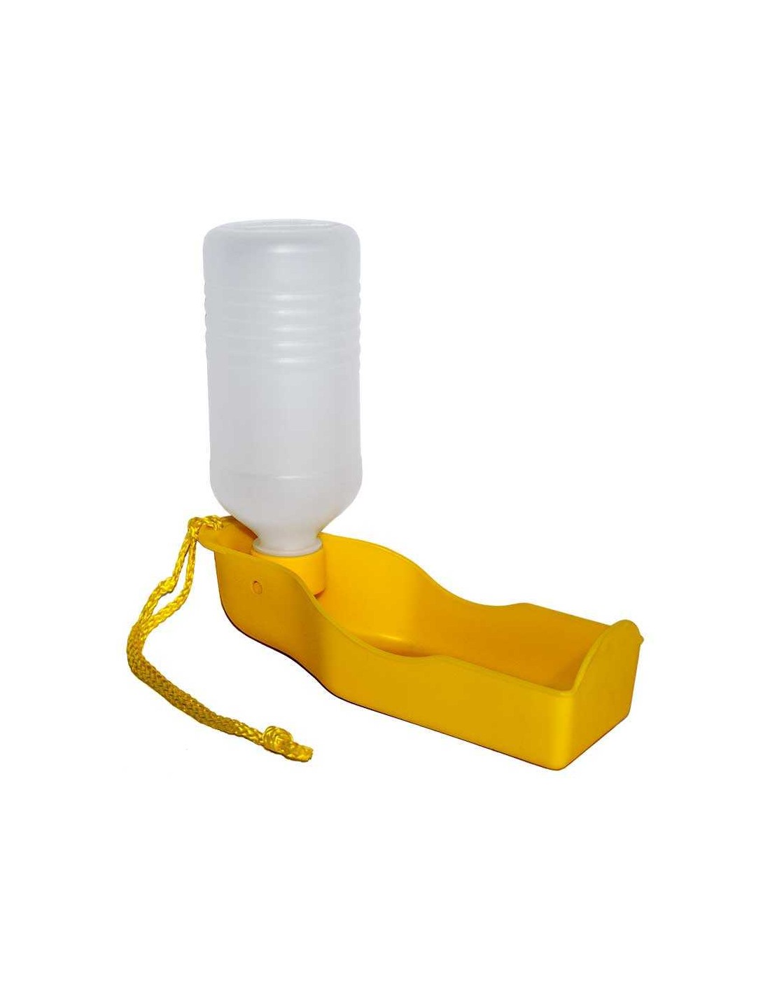 Diseñado para ser fácil de transportar, este bebedero cuenta con una botella integrada que permite suministrar agua sin necesidad de botellas adicionales ni accesorios.