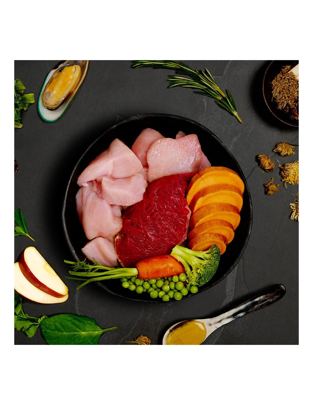 Este alimento húmedo combina jugosos trozos de ternera y pollo campero, cocinados a fuego lento en una rica salsa que preserva todos los nutrientes y sabores naturales.
