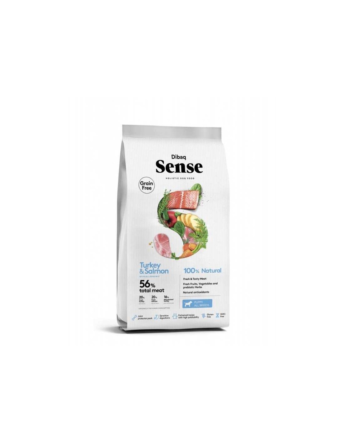 El DIBAQ SENSE PUPPY SALMON - PAVO es un alimento completo y hipoalergénico diseñado específicamente para cachorros de todas las razas, desde el primer mes de vida hasta los 12-18 meses.