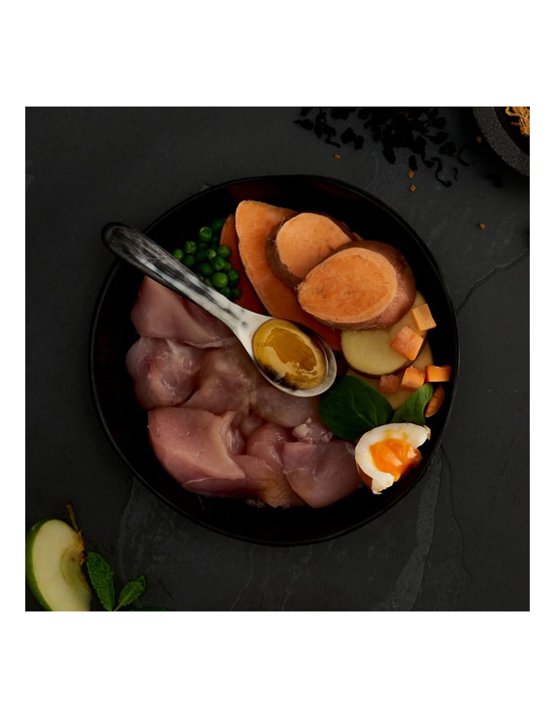 La combinación de frutas y verduras frescas, como batata, guisantes y zanahorias, proporciona vitaminas y minerales esenciales para una nutrición equilibrada.
