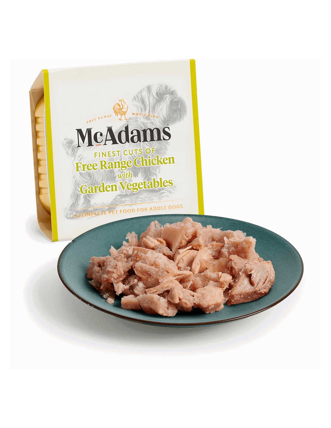 TARRINA DE POLLO CAMPERO Y VERDURAS DE LA HUERTA PARA PERROS MCADAMS - 150 GR