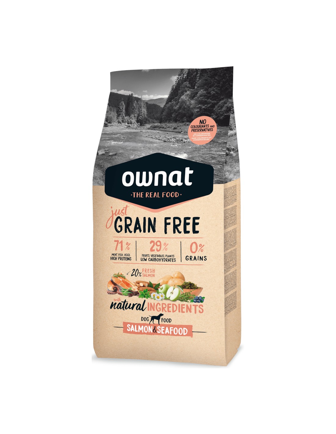 El OWNAT JUST GRAIN FREE SALMON - SEAFOOD es un pienso premium especialmente formulado para perros adultos que requieren una dieta sin cereales.