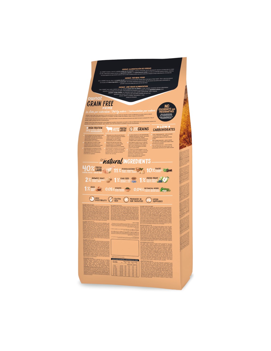 Carne fresca de cordero* (min. 40% antes de la extrusión), carne deshidratada (21%), guisantes enteros*, grasa animal (preservada con antioxidantes naturales), raíces de mandioca*, pescados deshidratados 5% (anchoveta, jurel y caballa), patata deshidratada*, levadura de cerveza*, vaina de algarroba*, pulpa de remolacha, semilla de lino*, huevo deshidratado*, manzana fresca* (1%), alfalfa deshidratada*, aceite de pescado (preservado con antioxidantes naturales), sal gema*, fructo y manano oligosacáridos, algas marinas deshidratadas*, glucosamina, condroitina, yucca schidigera, arándanos*, tomillo*, flor de manzanilla*, hinojo*, equinácea*, té verde*. *Ingredientes naturales.