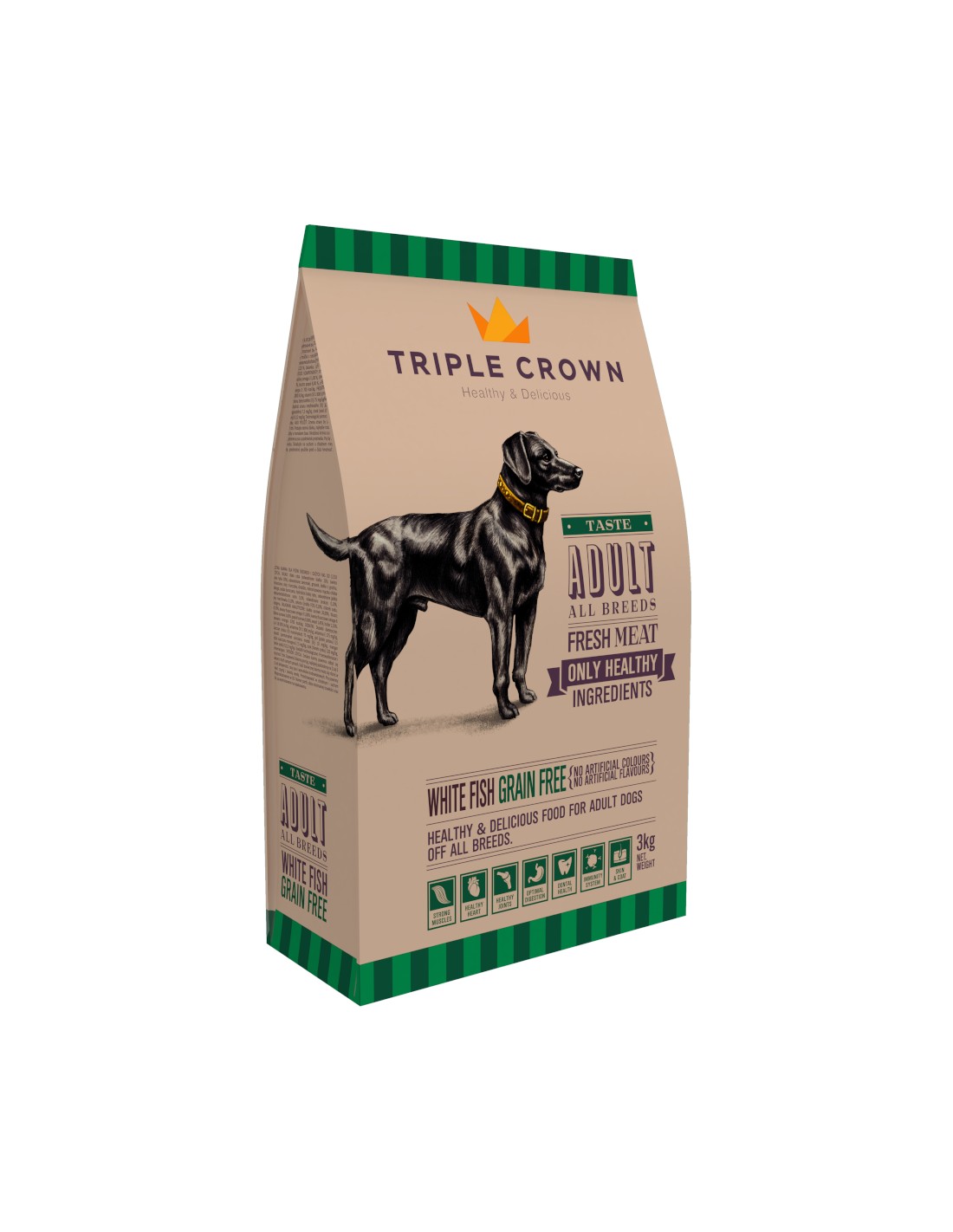 El Triple Crown Tasteful Grain Free es un pienso premium especialmente formulado para perros de razas medianas o grandes en edad adulta, con nivel de actividad medio y peso normal.