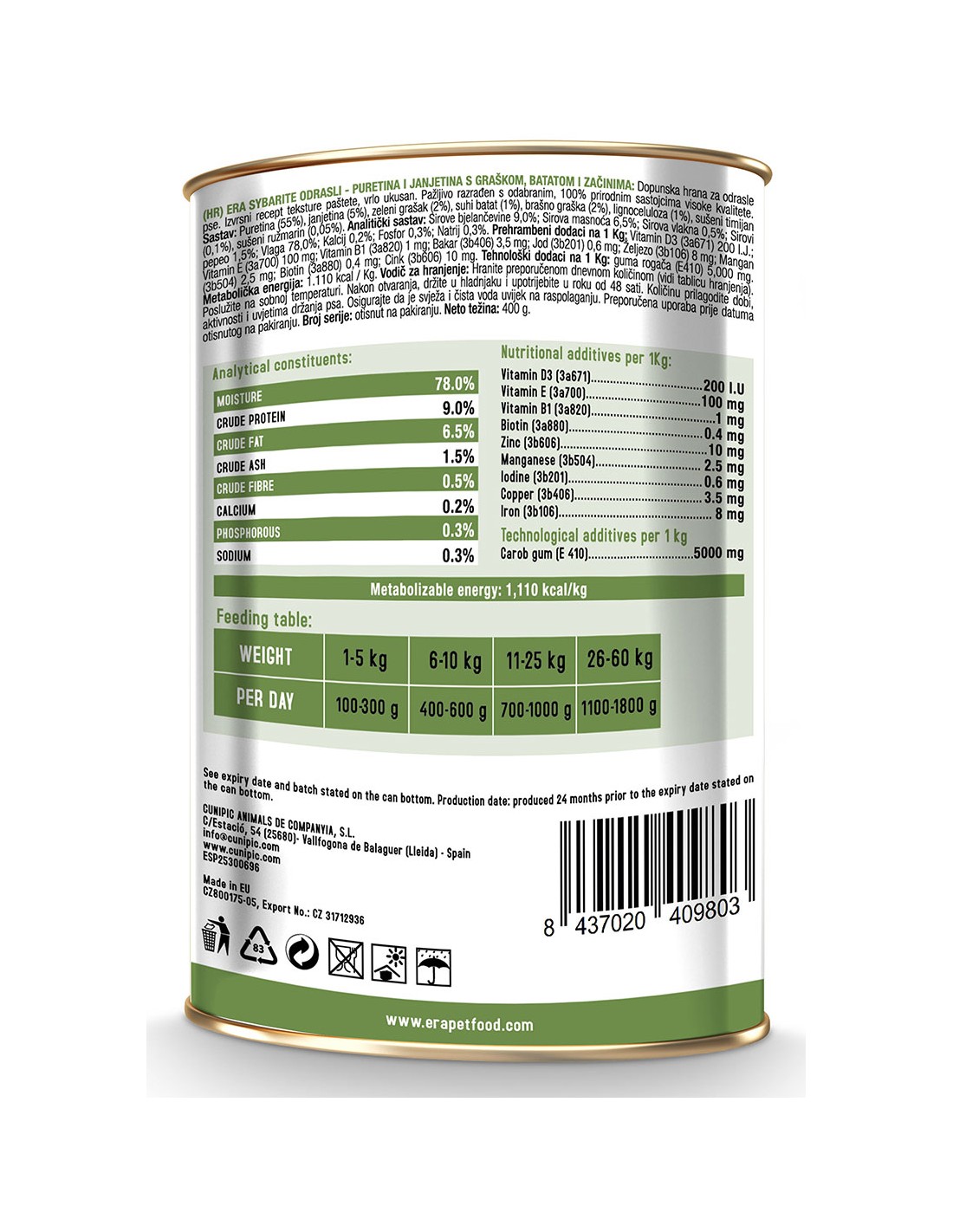 El ERA Sybarite Pavo y Cordero con Guisantes para Perros - 400 GR es una comida húmeda gourmet que combina ingredientes de alta calidad para ofrecer a tu perro una experiencia culinaria excepcional.