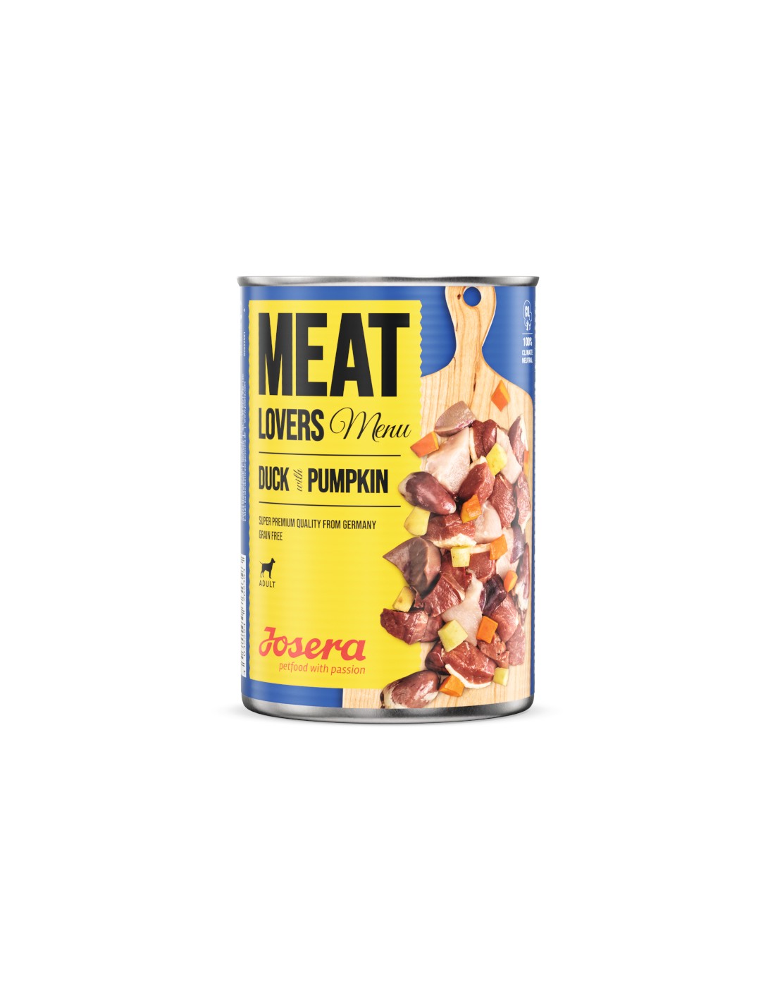 El alimento húmedo Josera Menu Pato con Calabaza para perros es una deliciosa opción para consentir a tu mascota.