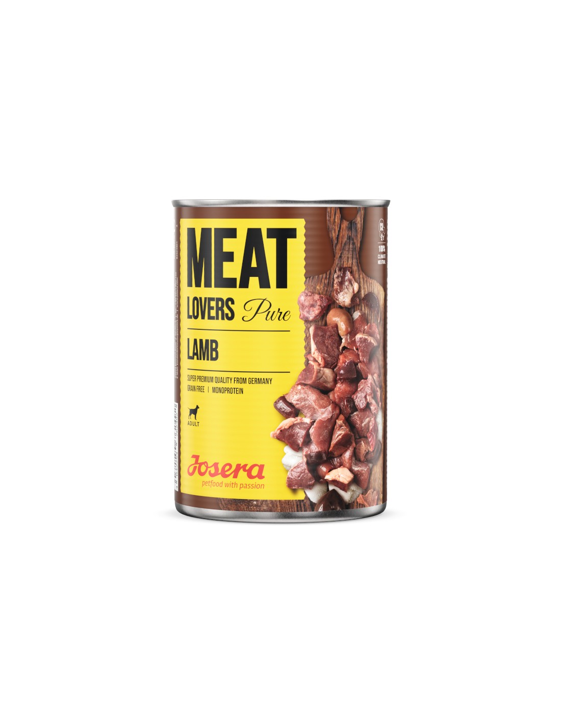 Josera Puro Cordero para Perros es un alimento húmedo de alta calidad, elaborado con ingredientes naturales y libre de aditivos artificiales.