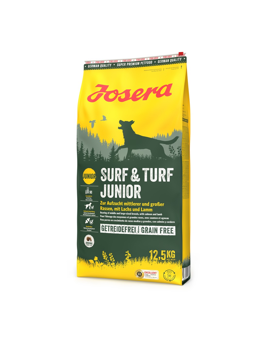 El pienso para perros Josera Surf & Turf Junior está diseñado para cachorros y perros jóvenes de razas medianas y grandes.