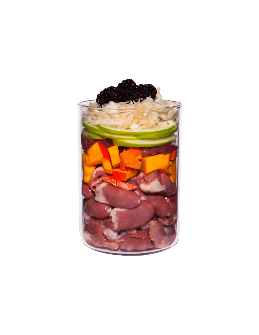 Con 400 gramos de contenido, esta receta combina pollo, chirivía, mora y diente de león, proporcionando una mezcla nutritiva y equilibrada.