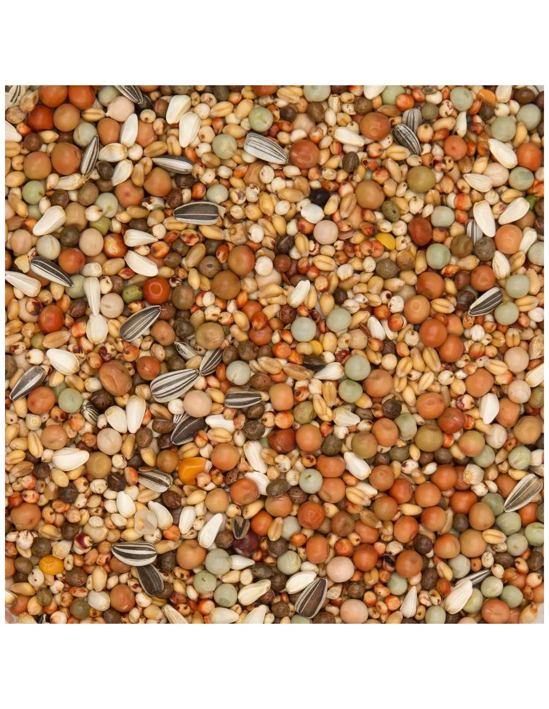 Además, la mezcla incluye ingredientes como trigo blanco, sorgo rojo, dari, guisantes dun, guisantes verdes pequeños, guisantes amarillos pequeños, semillas de girasol rayadas, lino y mostaza negra, proporcionando una nutrición completa y balanceada.