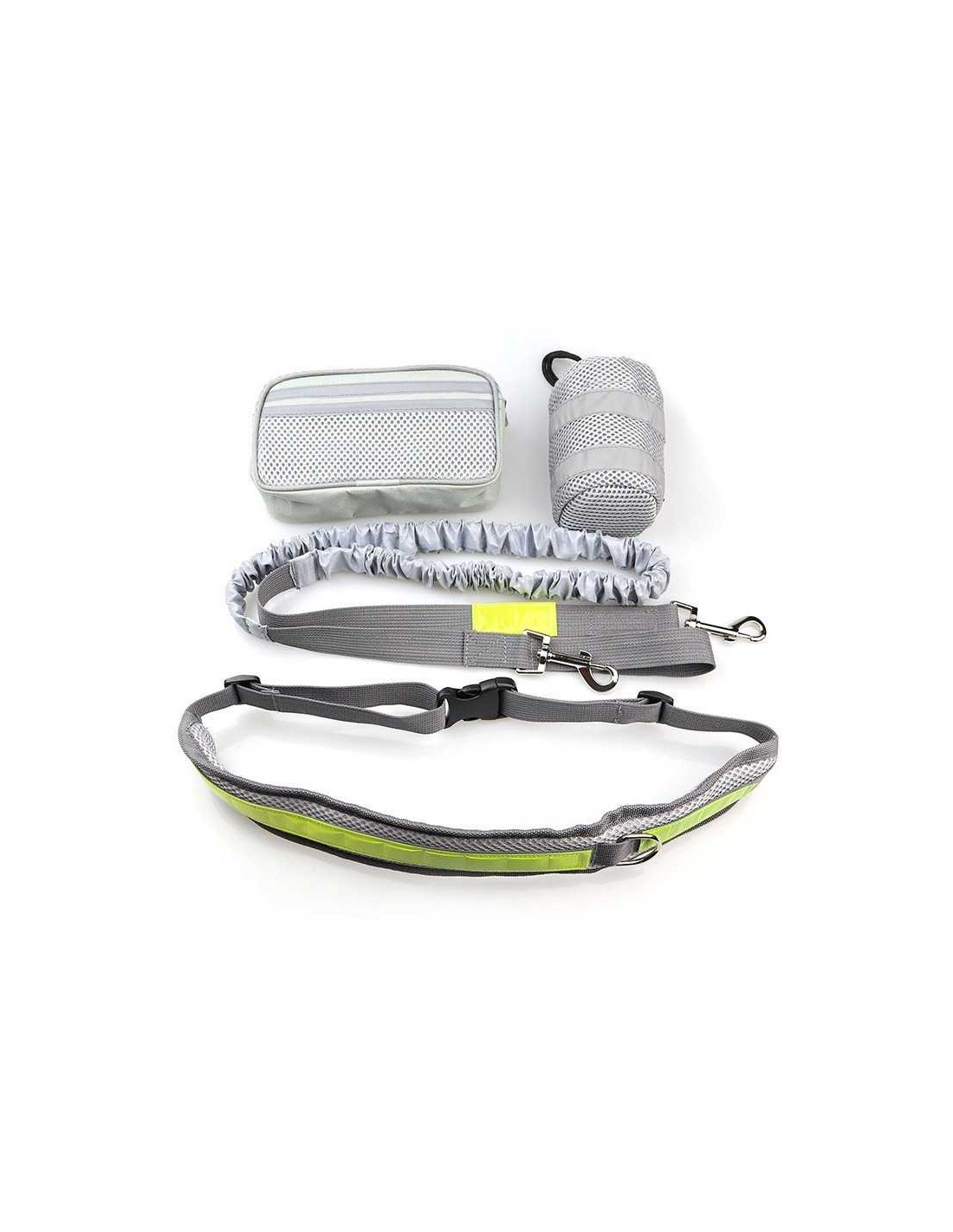 Kit de cinturón y correa regulable, ideal para pasear o correr con el perro atado a la cintura, dejando las manos libres, y permitiendo la práctica de “Canicross” con total comodidad y seguridad, tanto por el acolchado del cinturón, como por su correa elástica anti tirones y reflectante.