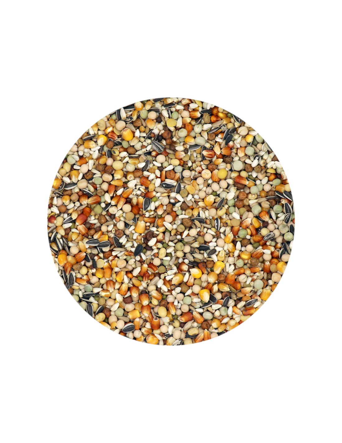 Maíz rojo 12%, Cunas Premium Maíz 5%, Cunas pequeñas Maíz 8%, Soja tostada 3%, Frijoles tic 1%, Arvejas 4%, Arvejas Dun 4%, Arvejas amarillas 4%, Arvejas verdes grandes 4%, Pequeñas guisantes verdes 4%, taras 7%, lentejas 2%, Katjang Idjoe 2%, paloma blanca trigo 2%, dari amarillo 5%, dari rojo 4%, cártamo 9%, arroz Paddy 7%, arroz partido 0.5%, avena pelada 2%, semillas pequeñas de girasol rayadas 1%, corazones de girasol 2%, semilla de cáñamo 0,5%, trigo sarraceno 1%, semilla de canaria 1%, mijo amarillo 1%, linaza marrón 0,5%, linaza amarilla 1%, colza negra 0,5%, semilla de cardo 1%, semilla de alcaravea negra 1%